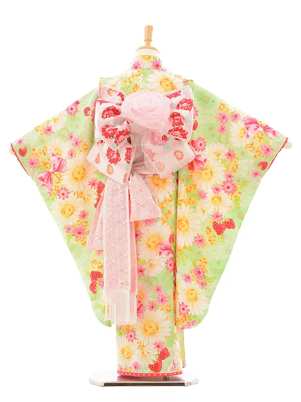 七五三レンタル(7女結び帯)D049 黄緑いちごと