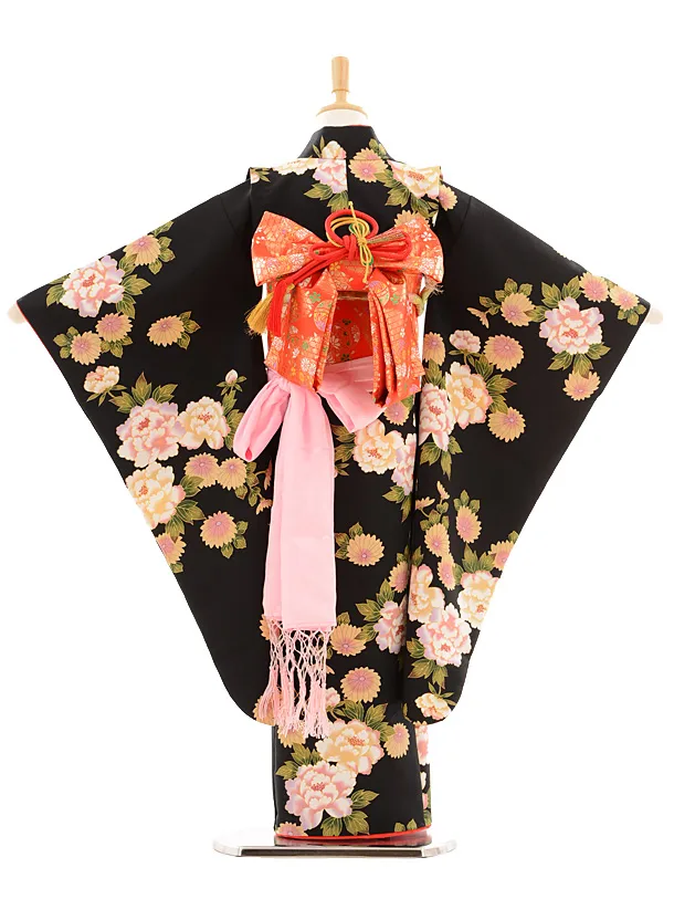 七五三レンタル(7女結び帯)D054 黒地ぼたん