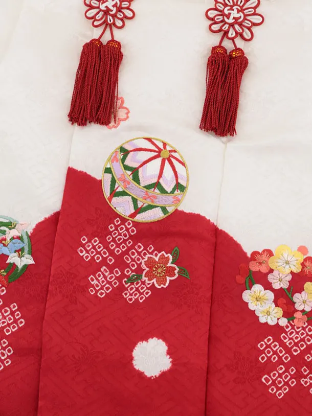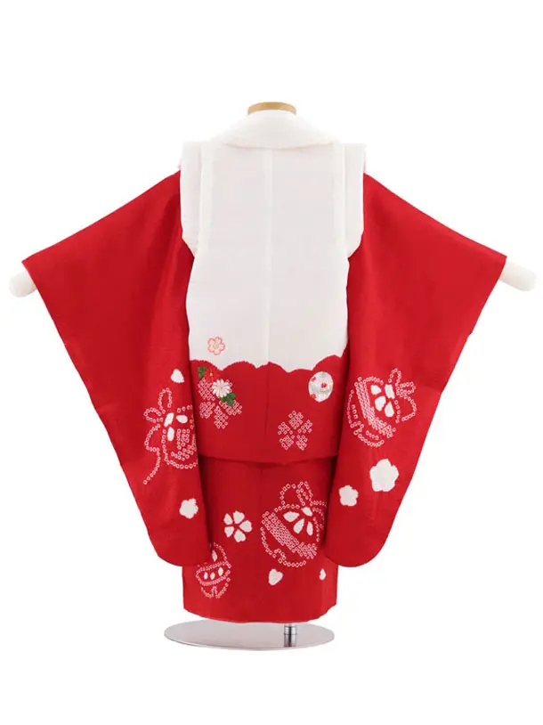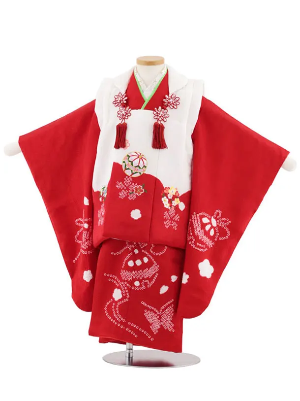 七五三レンタル(3歳女児被布)S023【正絹】白地刺繍鞠×赤地 鈴と蝶