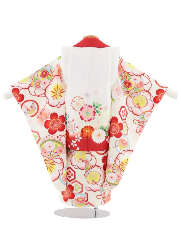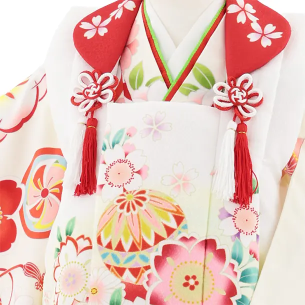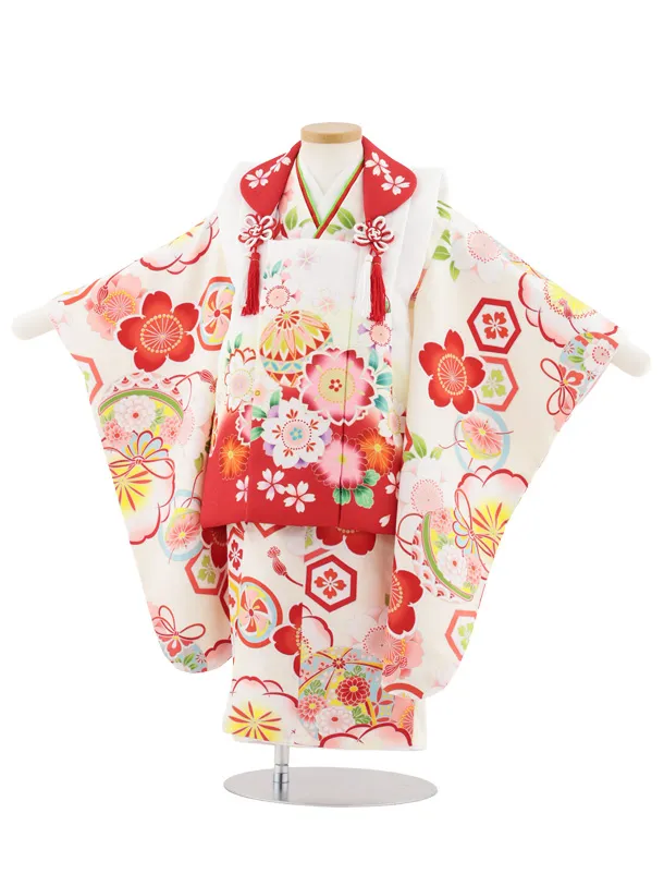 七五三レンタル(3歳女児被布)S070 白地鞠桜×アイボリー 亀甲紋に桜鈴