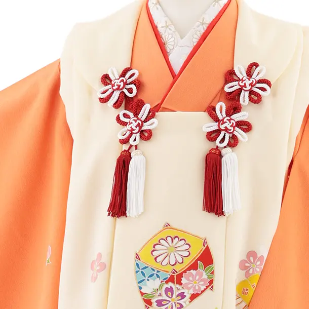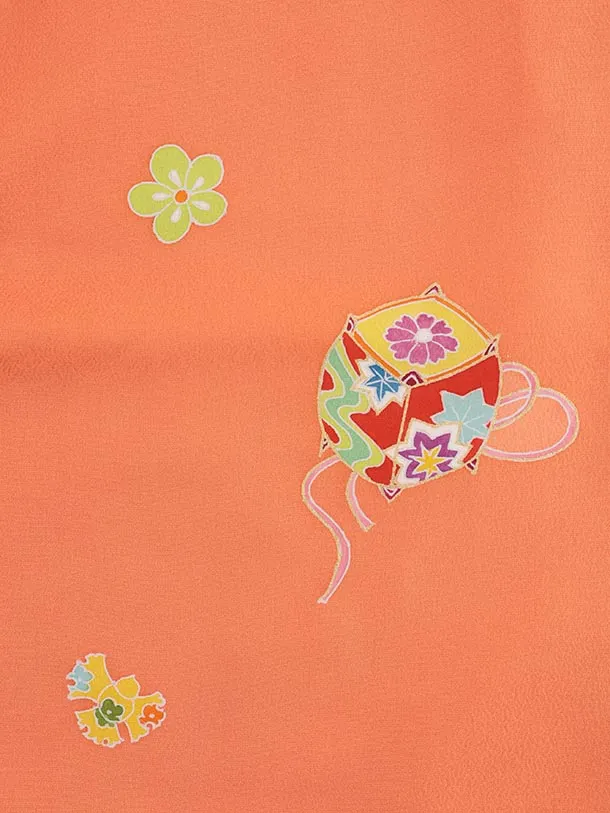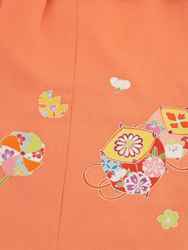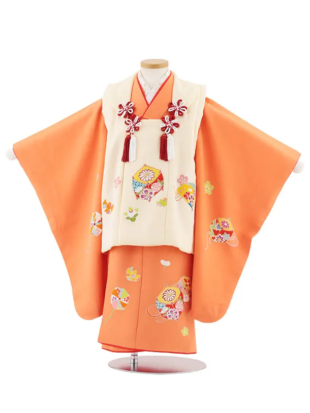 七五三(3歳女児被布)S091【正絹】ベージュ×オレンジ 糸巻きと風ぐるま