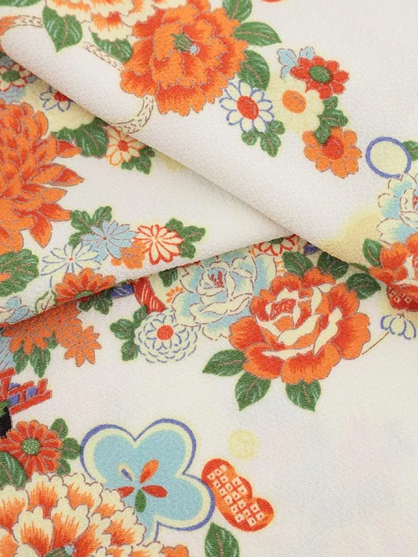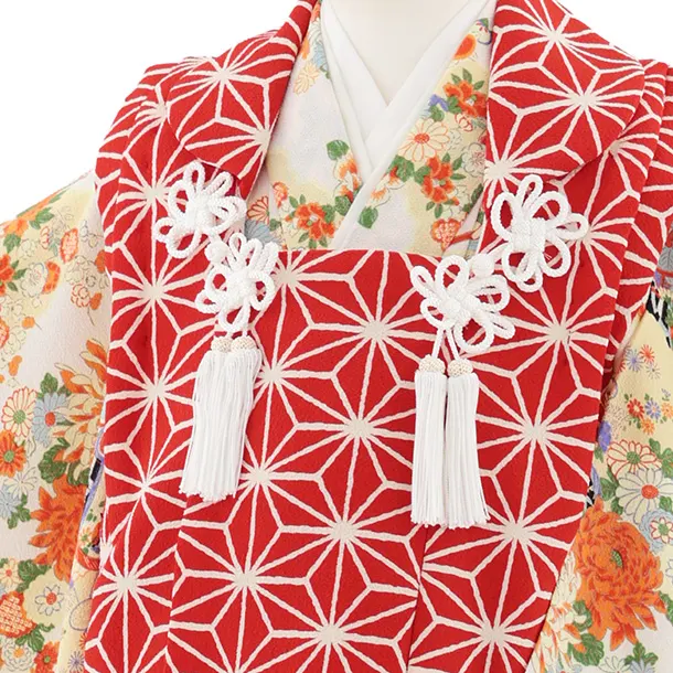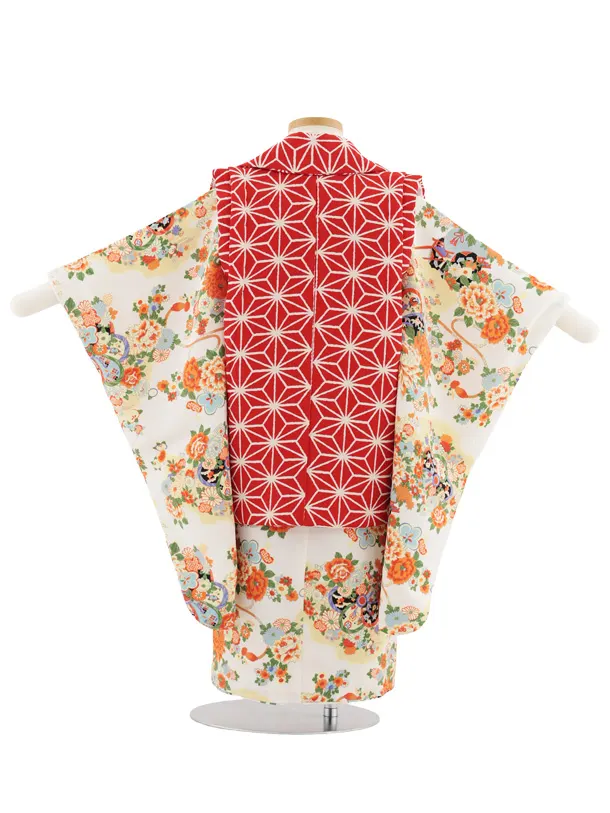 七五三レンタル(3歳女児被布)S096 赤地もみじ×白地 ちりめん花車に菊