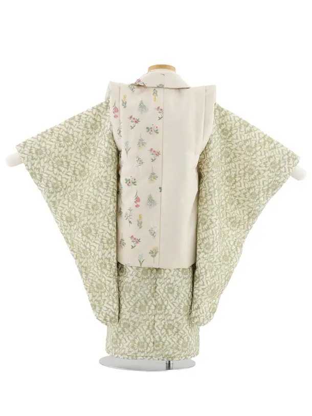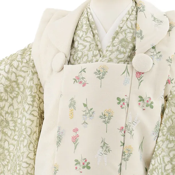 七五三(3歳女児被布)S101 ベージュ片身替り花×グリーンレースフラワー