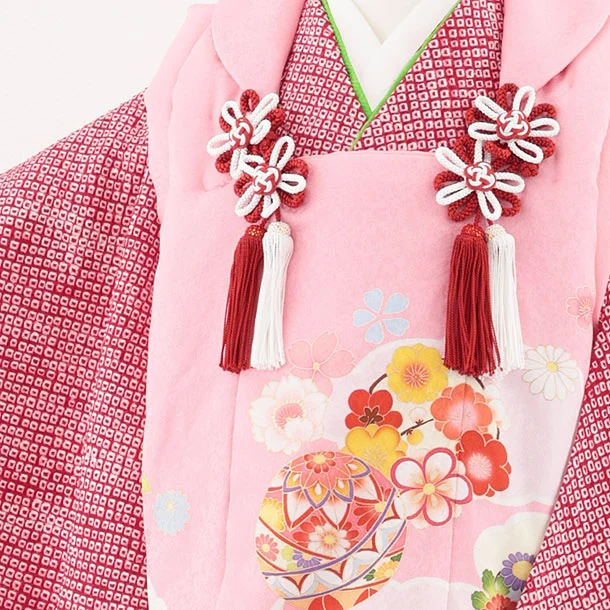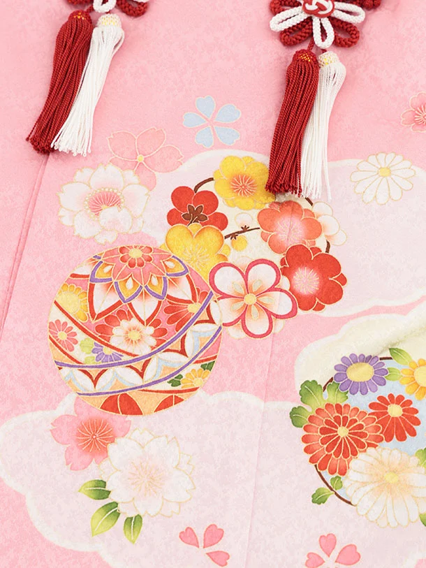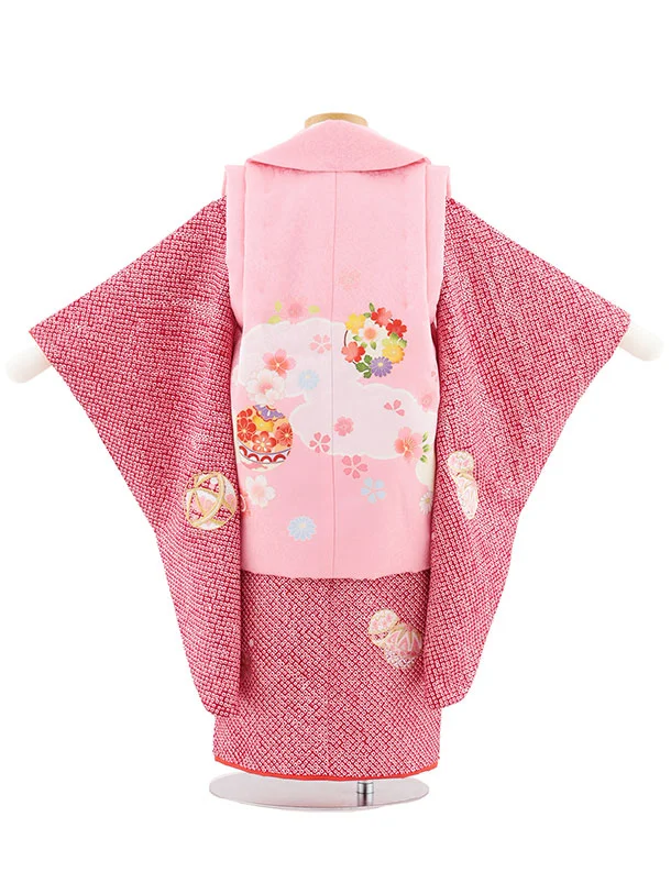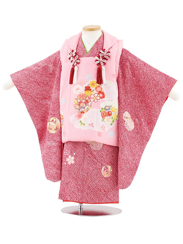 七五三レンタル(3歳女児被布)S118【正絹】ピンク花鞠×赤絞り刺繍鞠