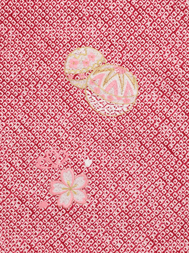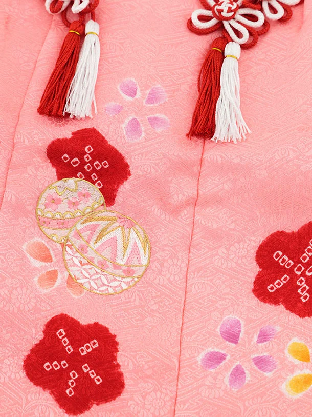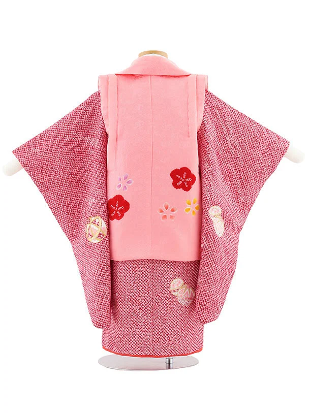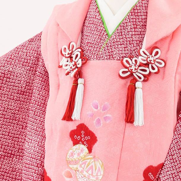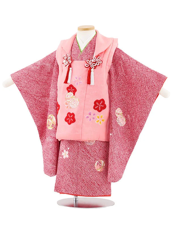 七五三レンタル(3歳女児被布)S122【正絹】ピンク刺繍マリ×赤絞り刺繍マリ