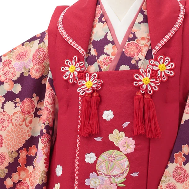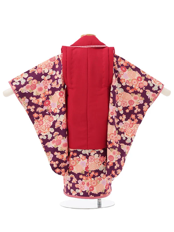 七五三レンタル(3歳女児被布)S145 赤 刺繍まり花×紫花づくし