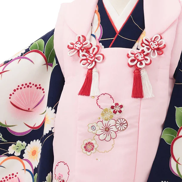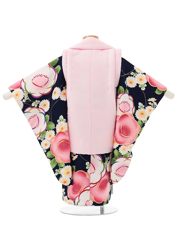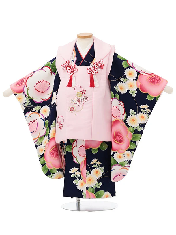 七五三レンタル(3歳女児被布)S147 ピンク 雪輪刺繍×紺地 梅菊