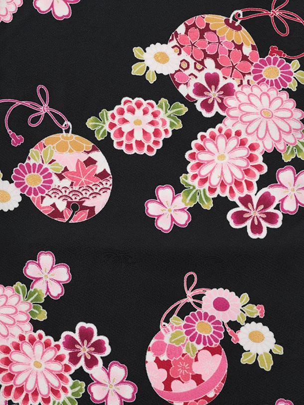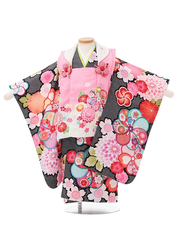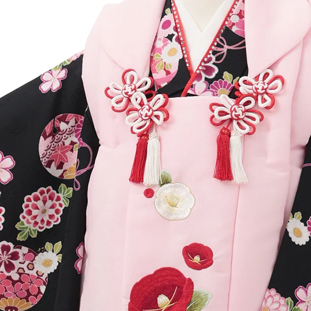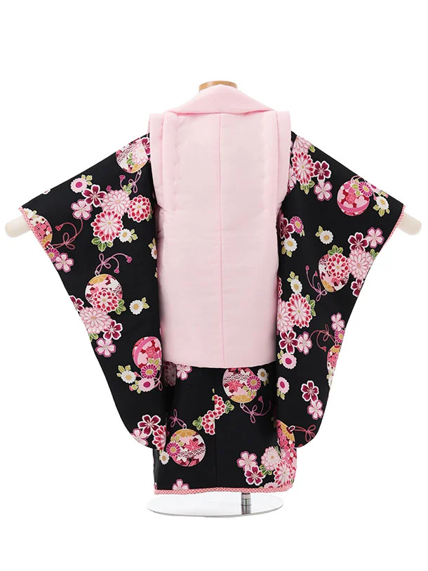 七五三レンタル(3歳女児被布)S154 ピンク 刺繍 椿×黒 菊に鈴