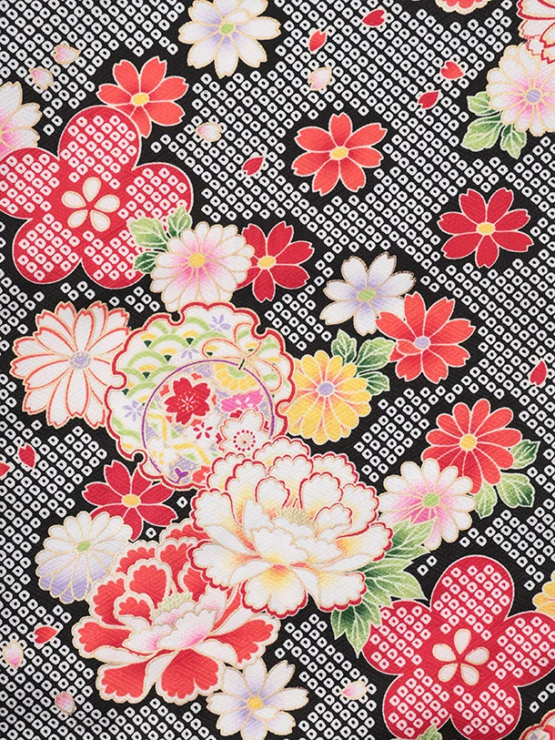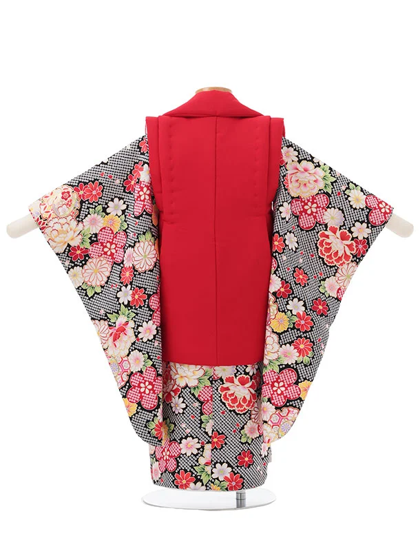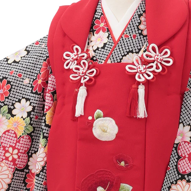 七五三レンタル(3歳女児被布)S160 赤 刺繍 椿×黒地 花
