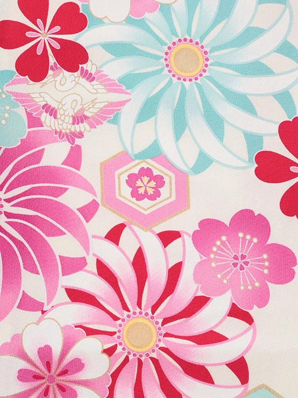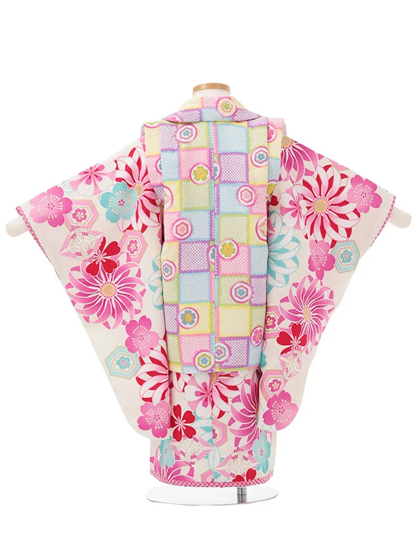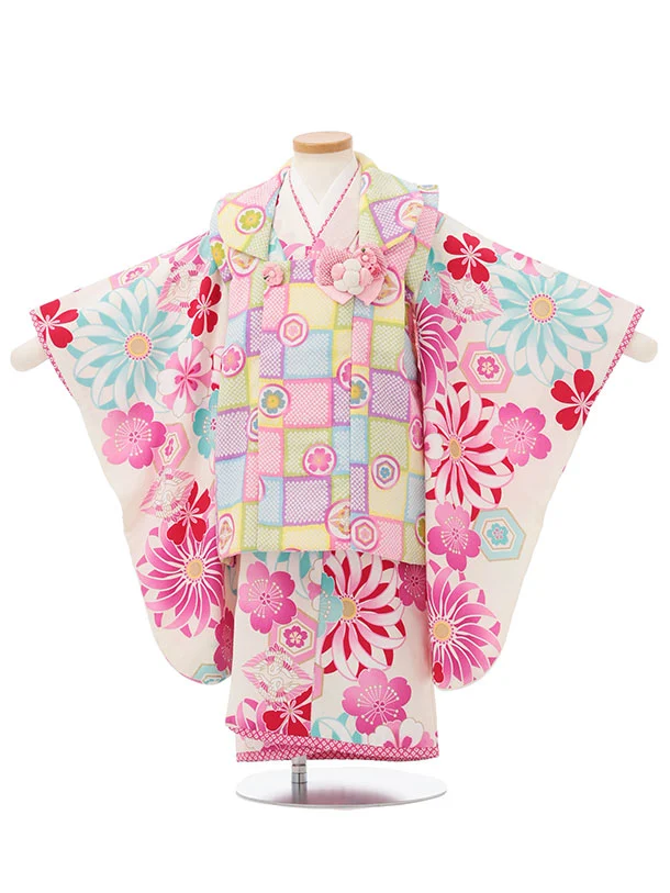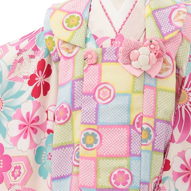 七五三レンタル(3歳女児被布)S175 カラフル丸紋×白地 菊桜