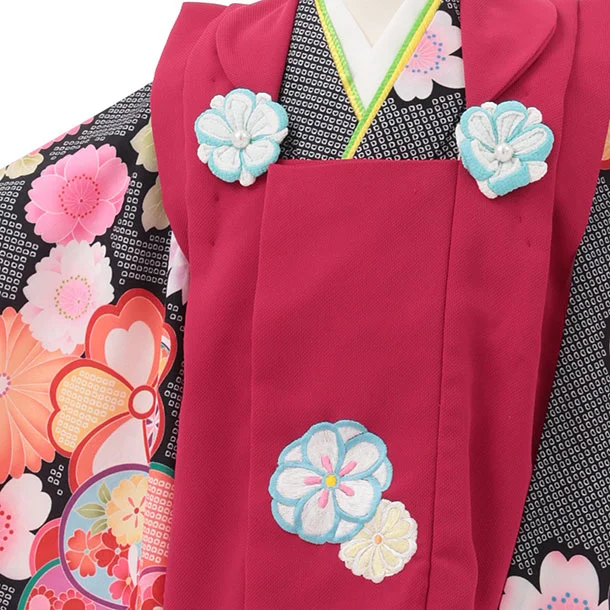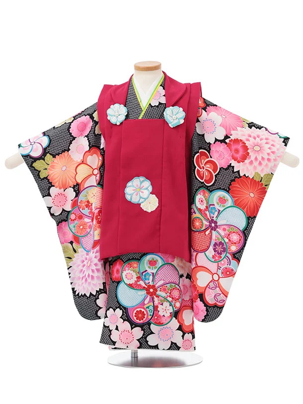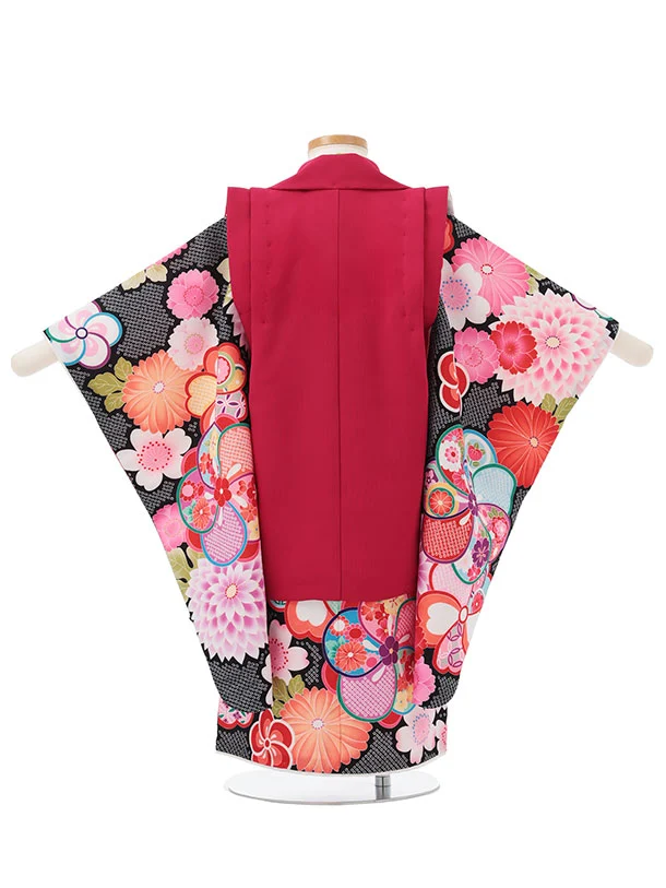 七五三レンタル(3歳女児被布)S183 ローズピンク×黒地 鹿の子 ねじり梅