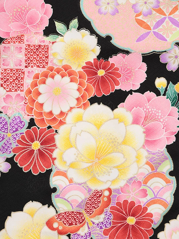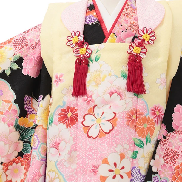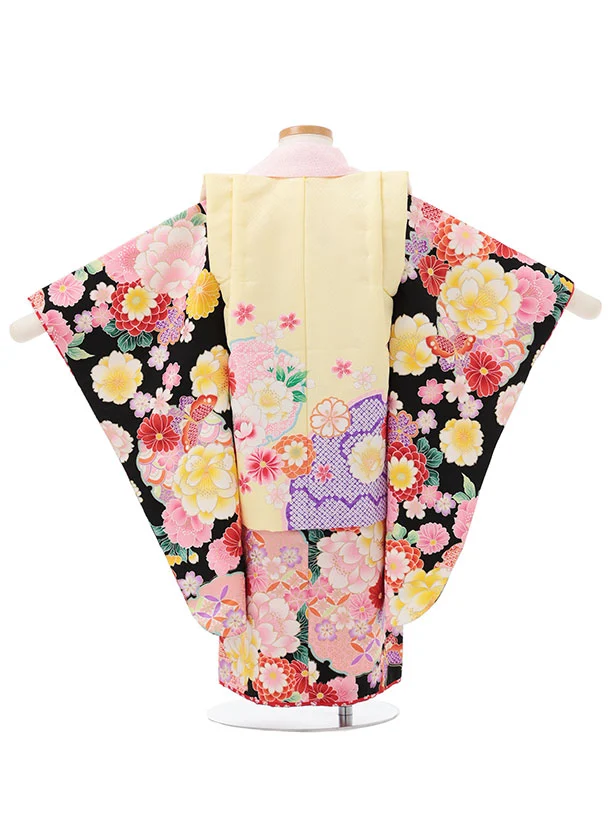 七五三レンタル(3歳女児被布)S195 うす黄色 雪輪花×黒地 花蝶