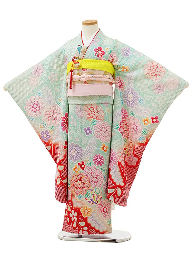 七五三(7歳女の子袋帯)Y042【高級正絹】ヒワ色裾赤 絞りまり花