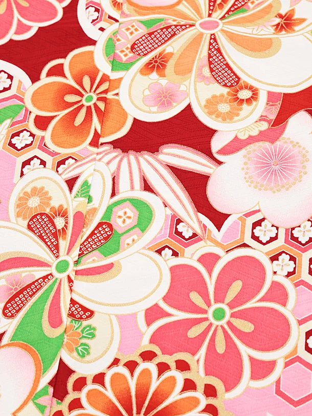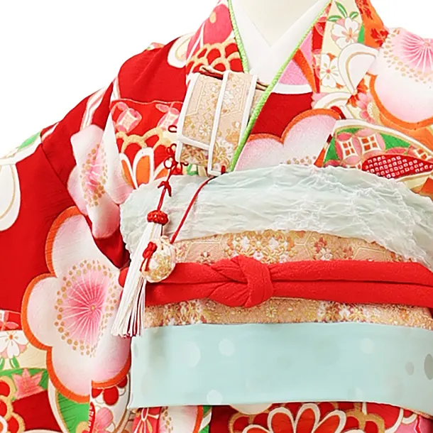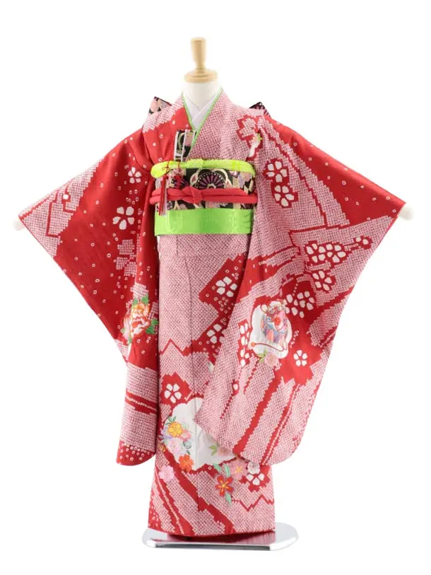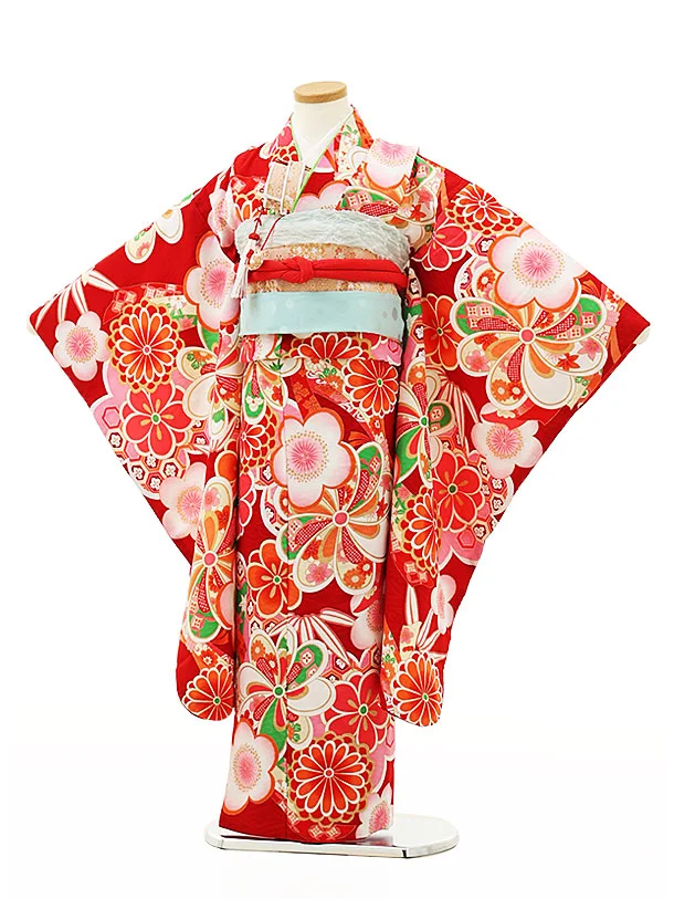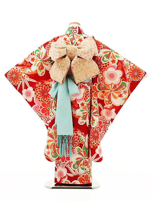 七五三レンタル(7歳女結び帯)Y077 赤地 ねじり菊 梅