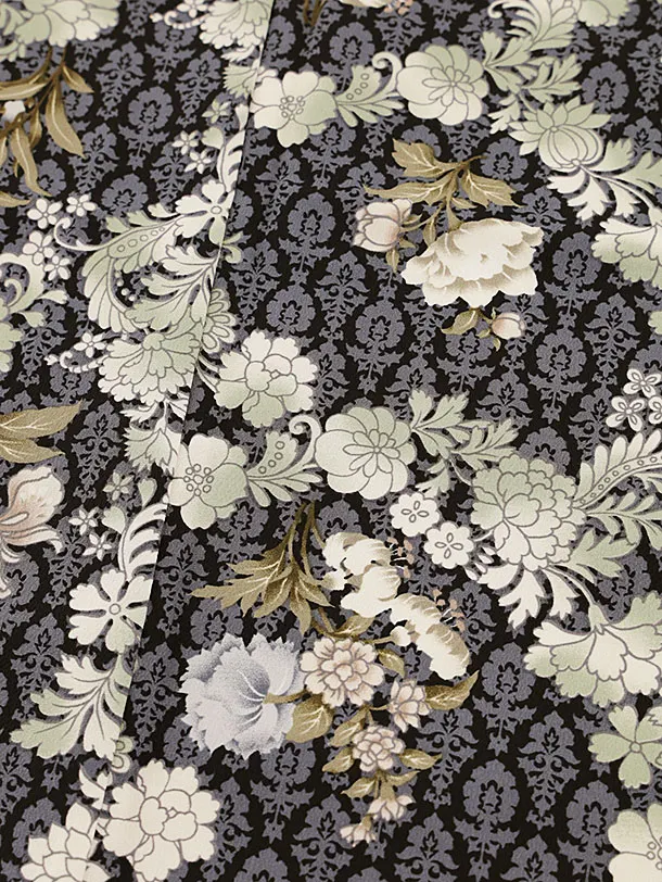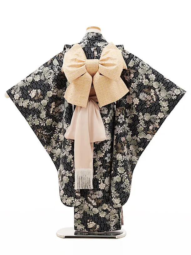 七五三レンタル(7歳女結び帯)Y119 黒グレー ダマスク柄に花