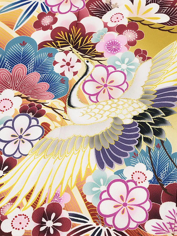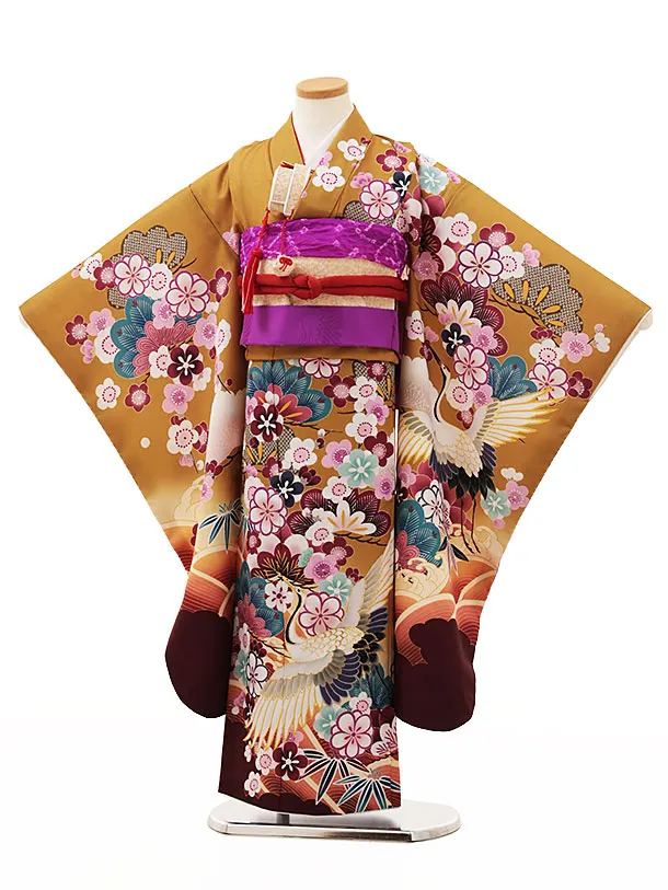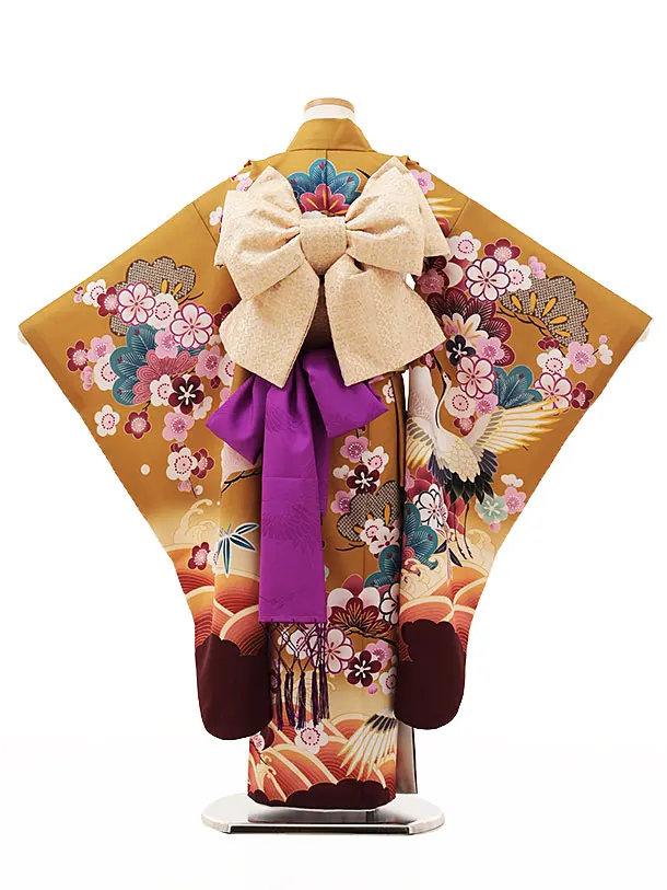 七五三レンタル(7歳女結び帯)Y139 からしグリーン 鶴に梅
