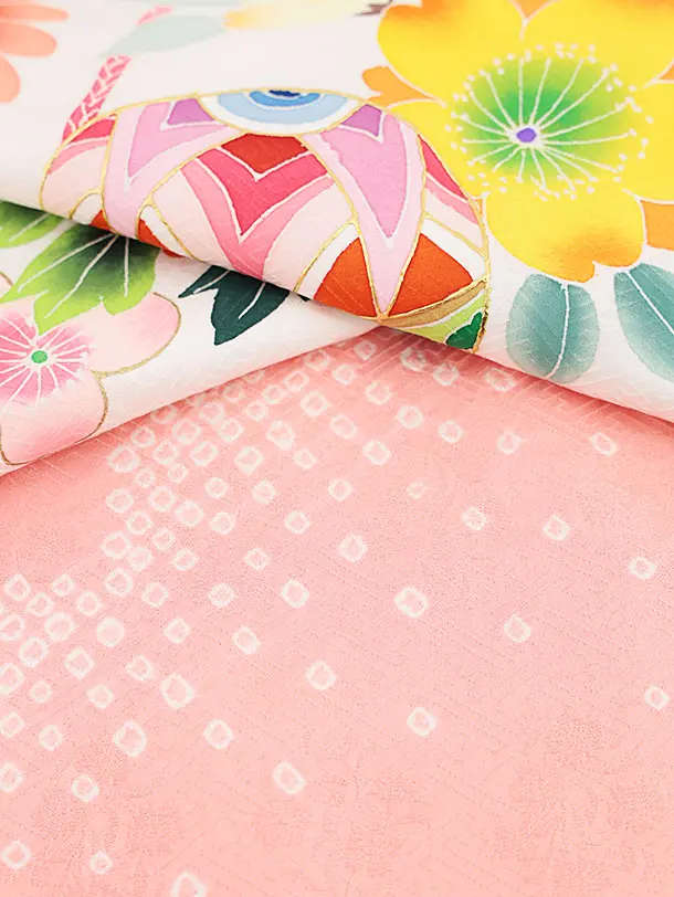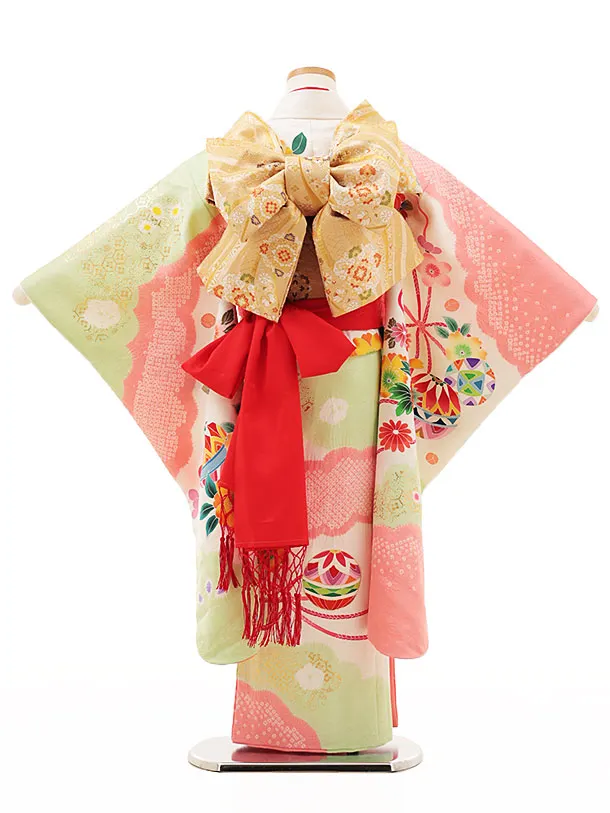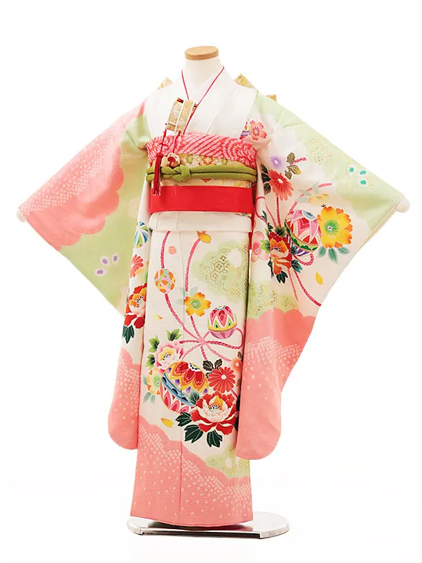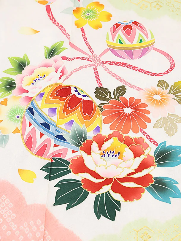 七五三(7歳結び帯)Y164【正絹】白地 ピンク雲取り まり 牡丹