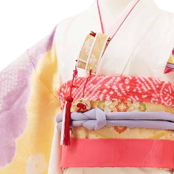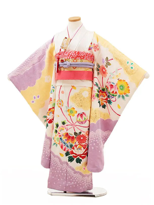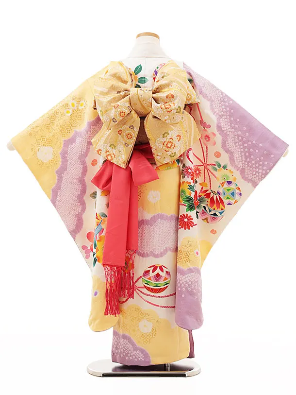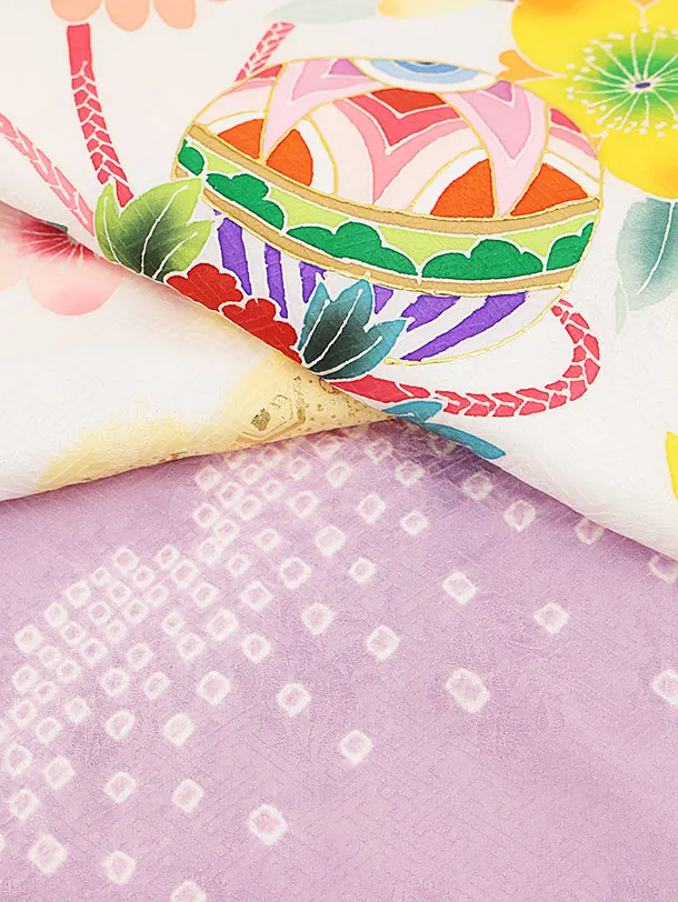 七五三(7歳結び帯)Y165【正絹】白地 パープル雲取り まり 牡丹