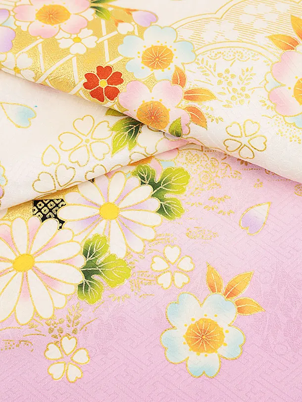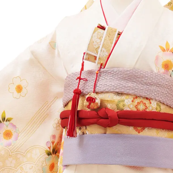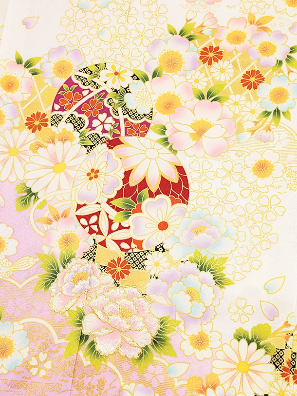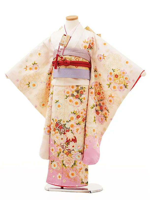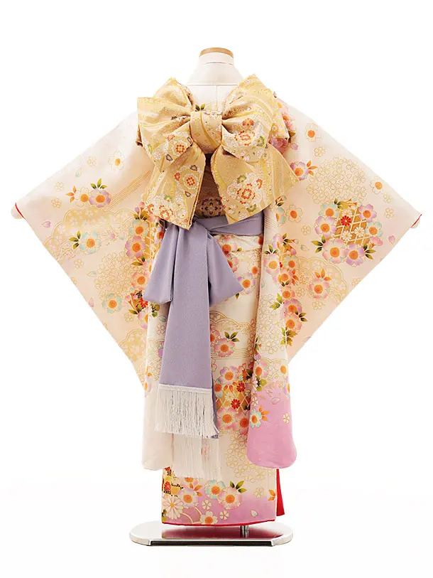 七五三(7歳結び帯)Y166【正絹】オフホワイト 裾紫 花