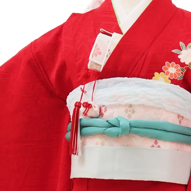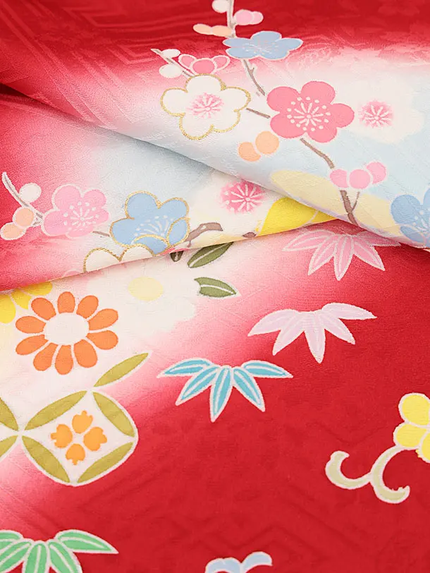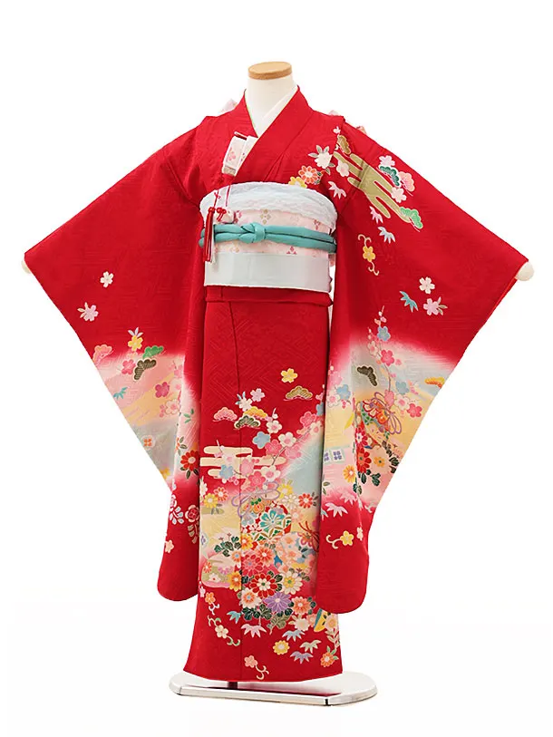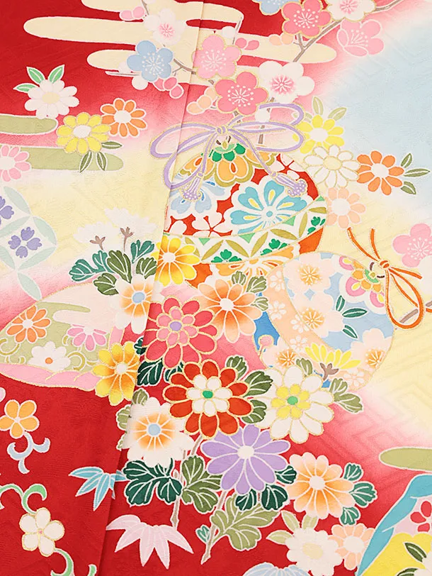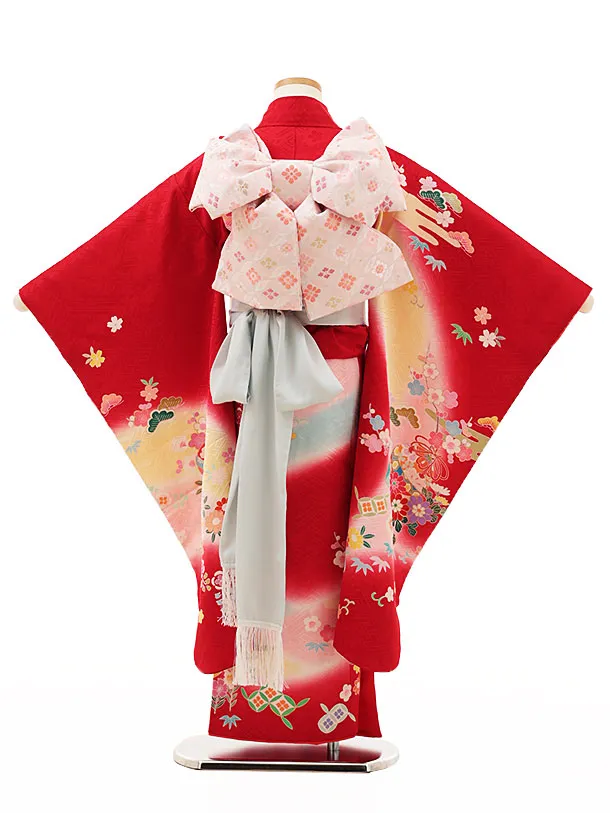 七五三(7歳結び帯)Y177【正絹】赤地 鈴に四季花