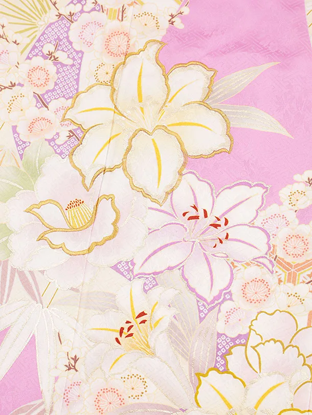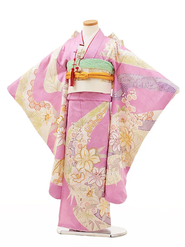 七五三(7歳結び帯)Y178【正絹】ピンク地 百合 八重桜