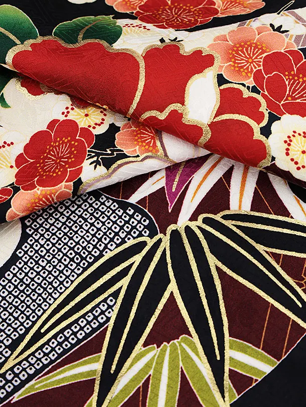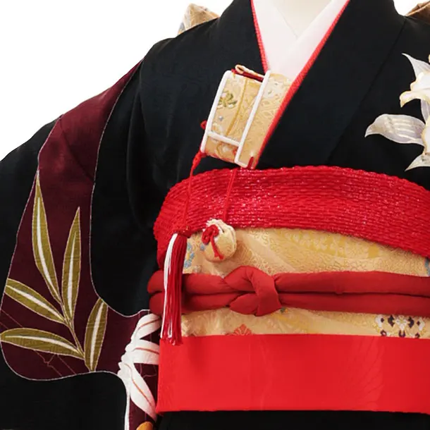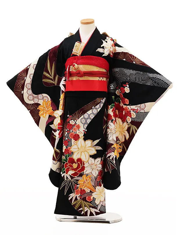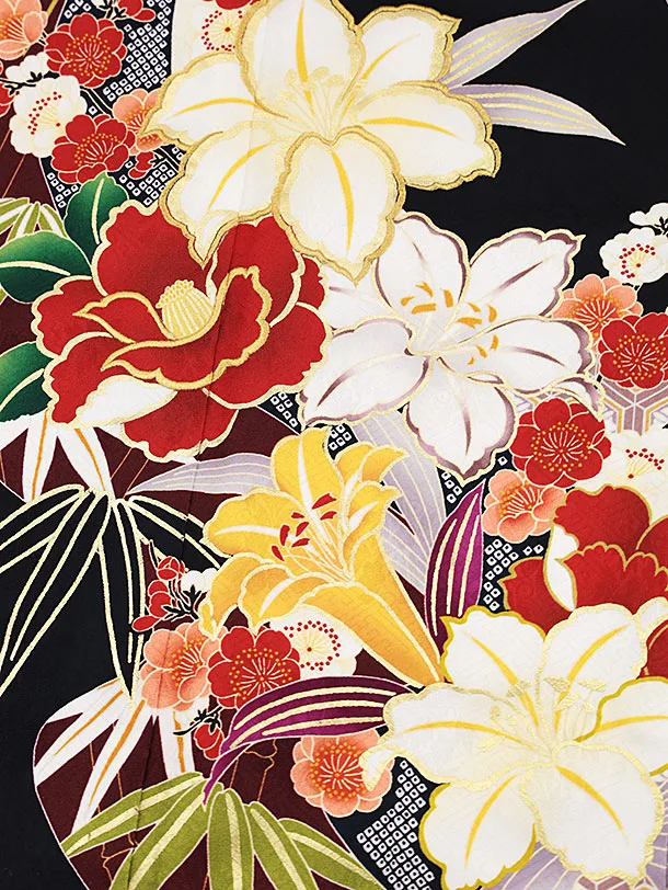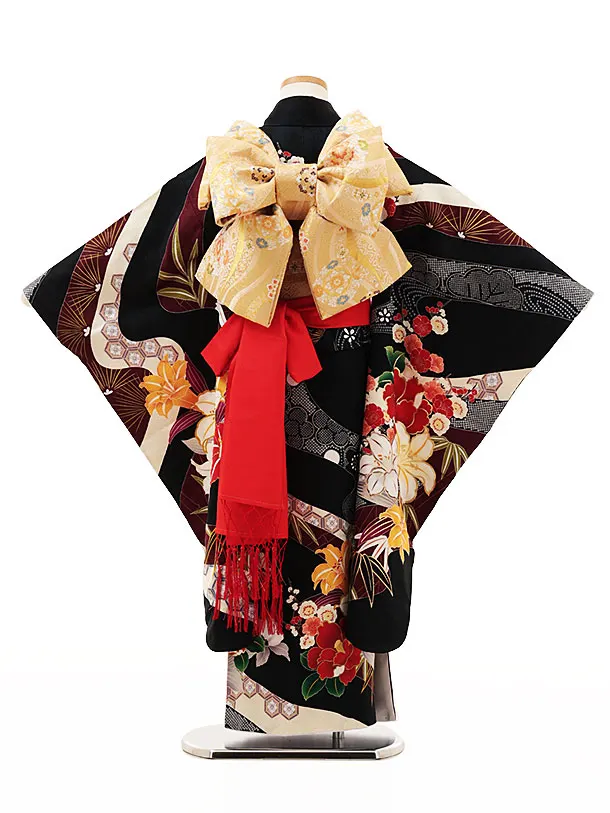 七五三(7歳結び帯)Y180【正絹】黒地 百合 八重桜
