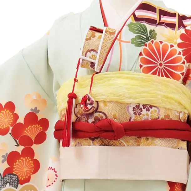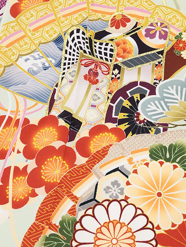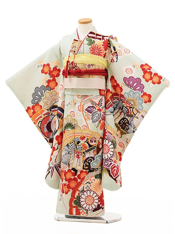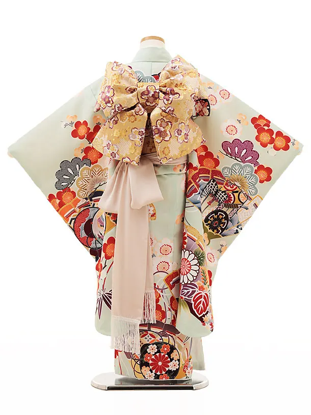 七五三(7歳結び帯)Y202 ペールグリーン 桧扇に御所車