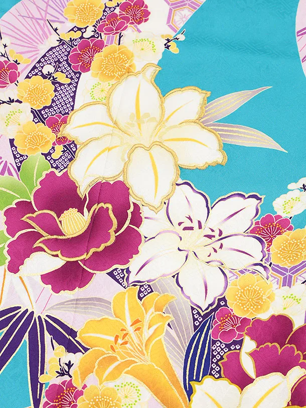 七五三(7歳女の子袋帯)Y254【正絹】ブルー 百合八重椿