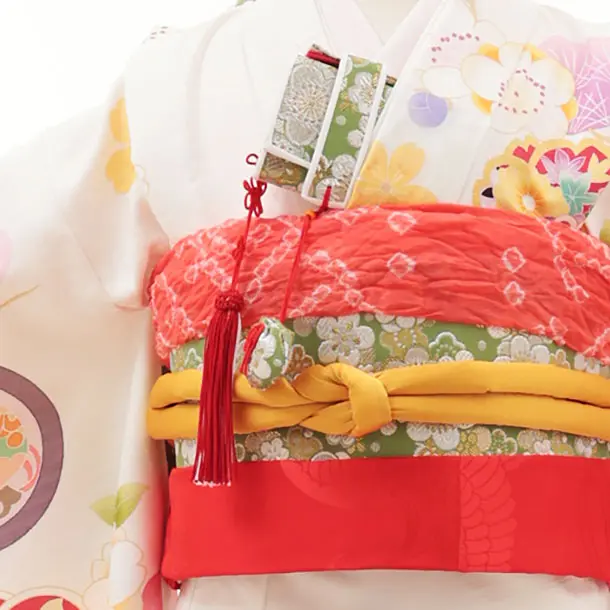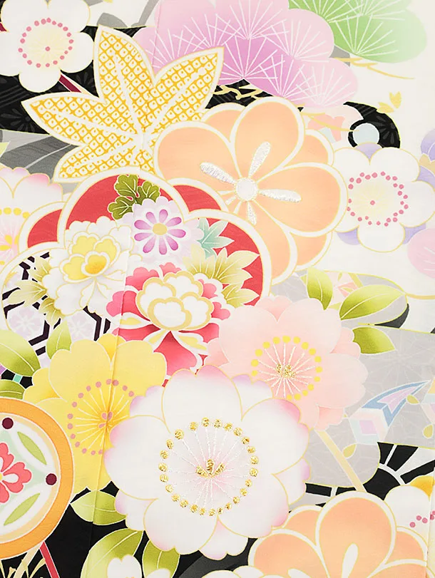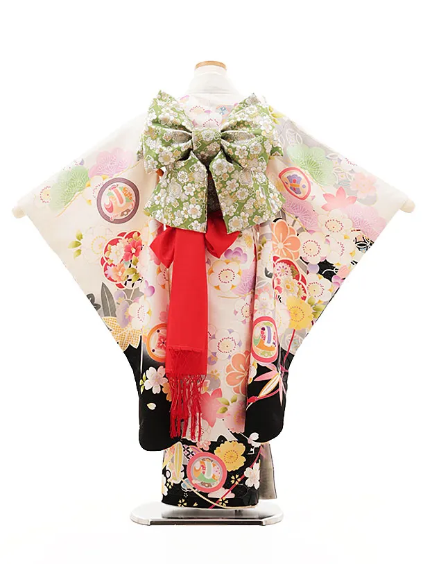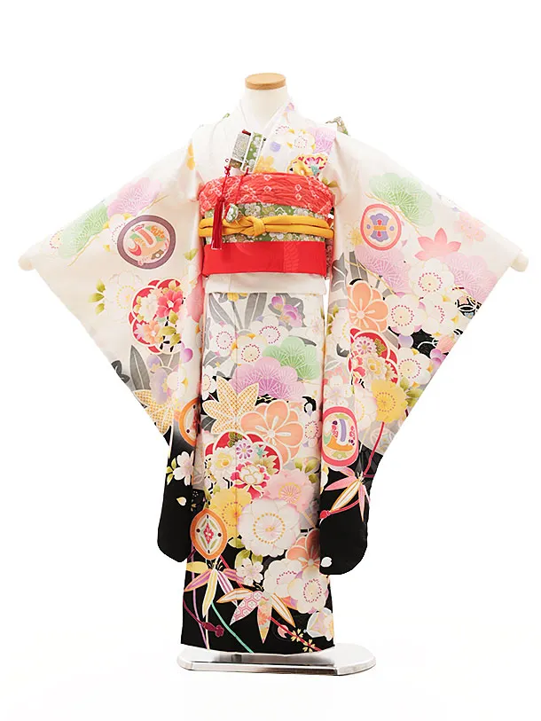 七五三(7歳結び帯)Y305 白地裾黒 四季花