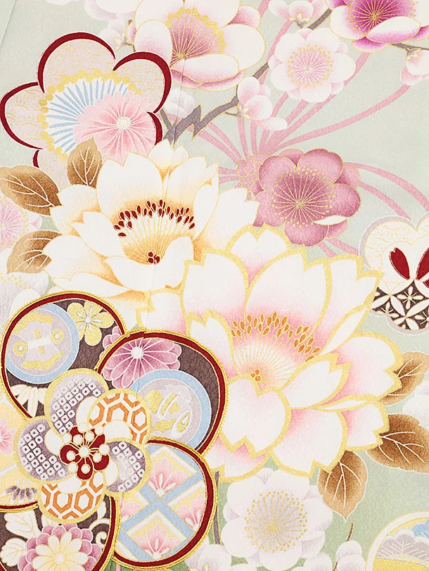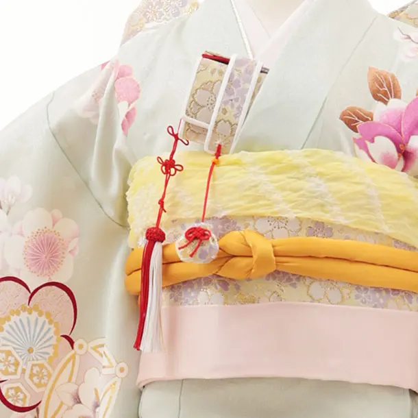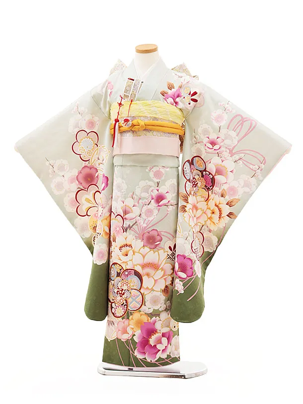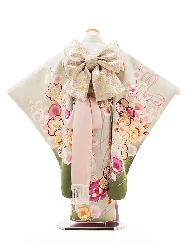 七五三(7歳結び帯)Y321 薄ヒワ色 裾ぼかし 梅花づくし
