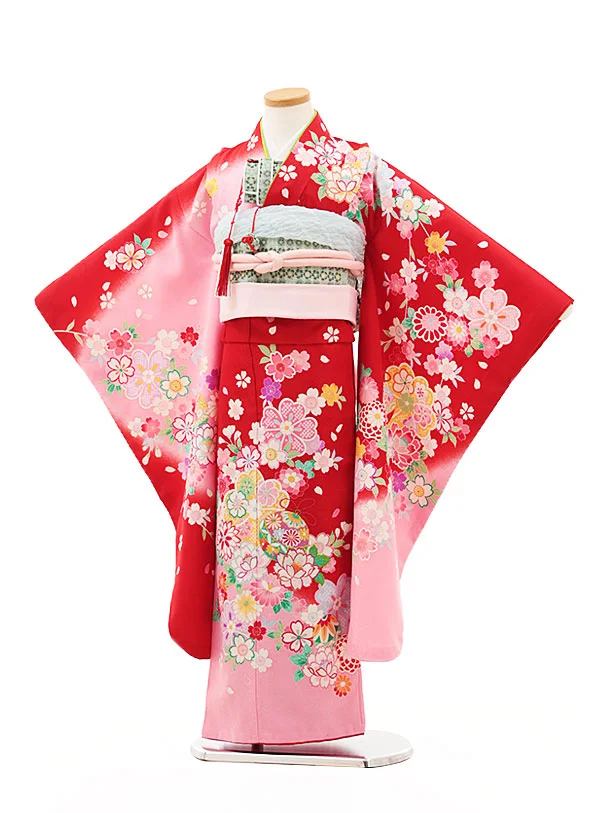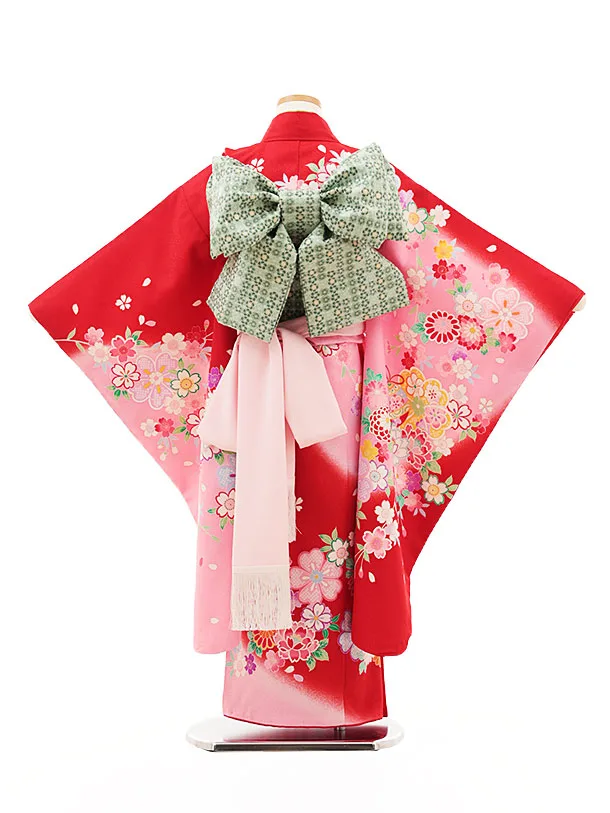 七五三(7歳結び帯)Y344 赤地 裾ピンク 鈴花づくし