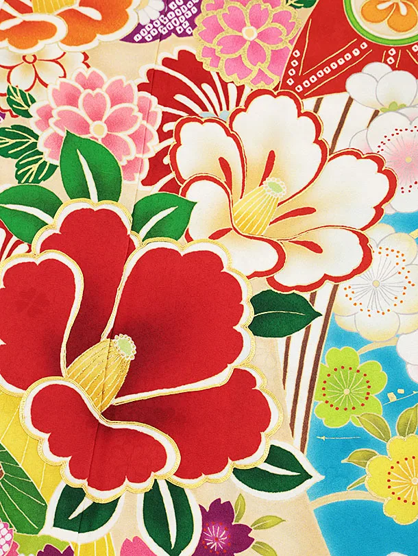 七五三(7歳結び帯)Y354【正絹】白地 椿 花づくし