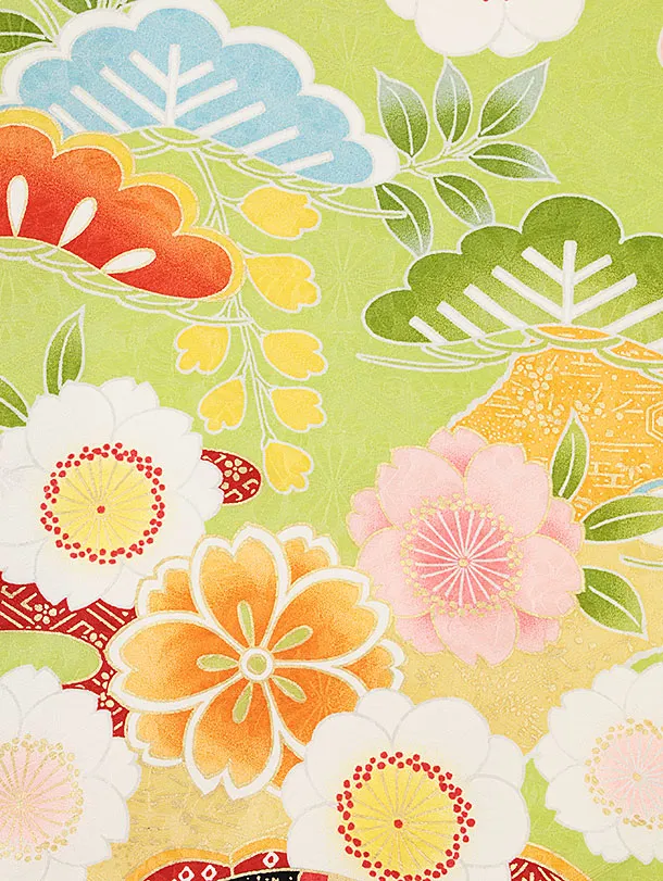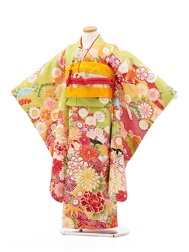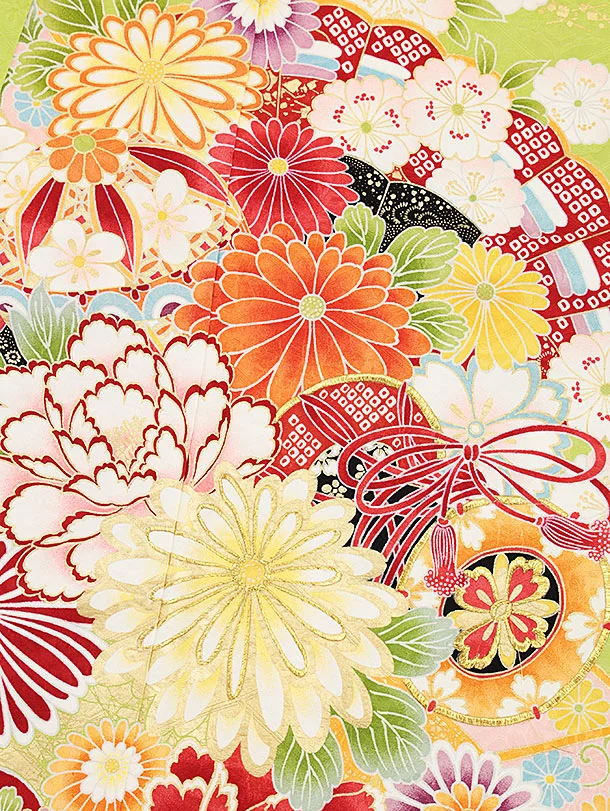 七五三(7歳結び帯)Y355【正絹】萌黄色 まり 花づくし