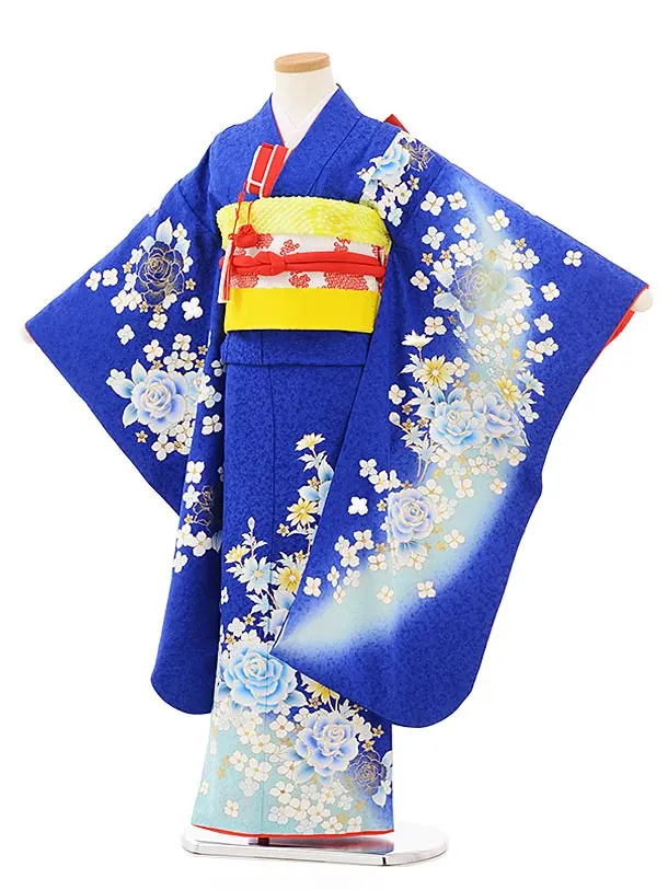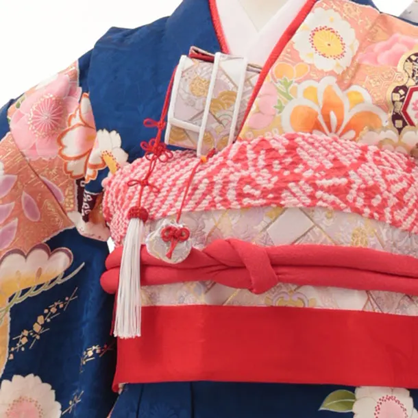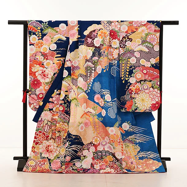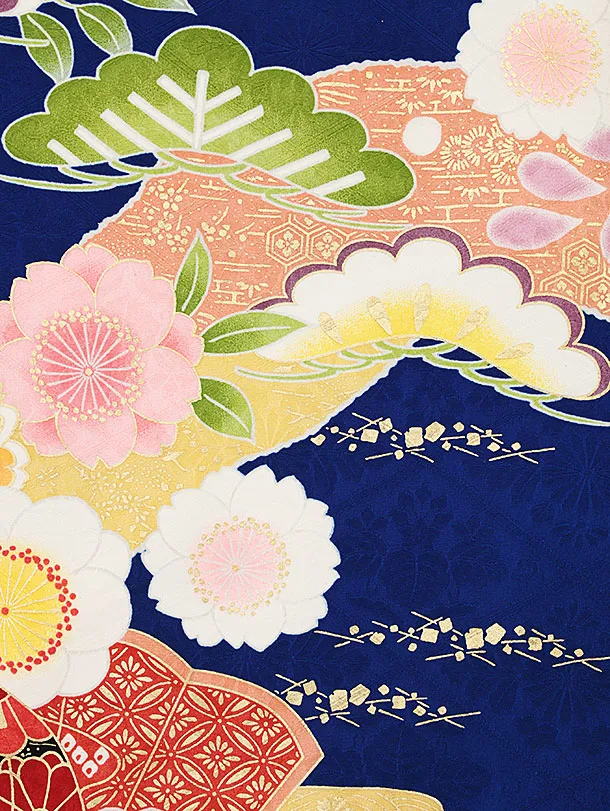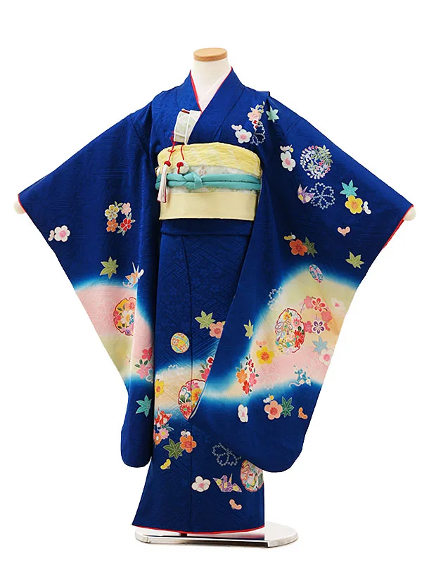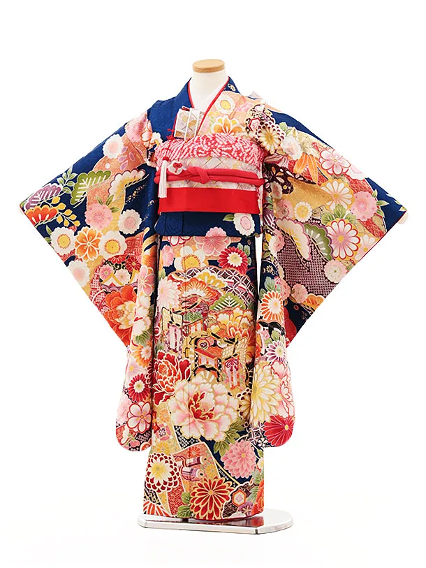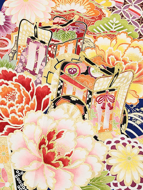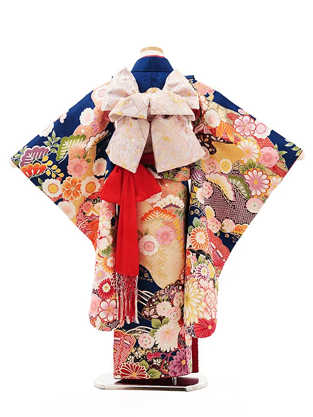 七五三(7歳結び帯)Y356【正絹】紺地 御所車 花づくし