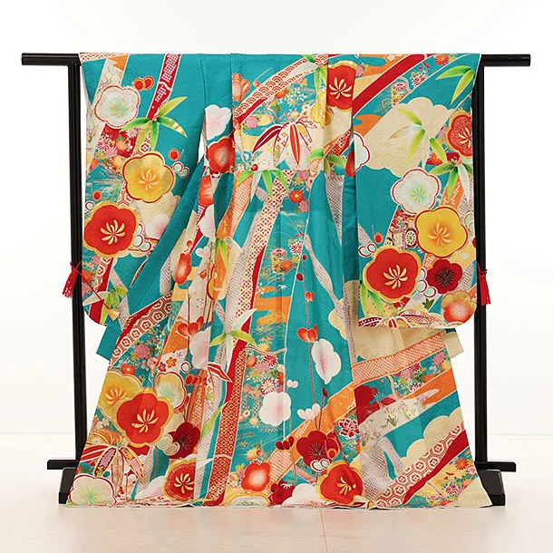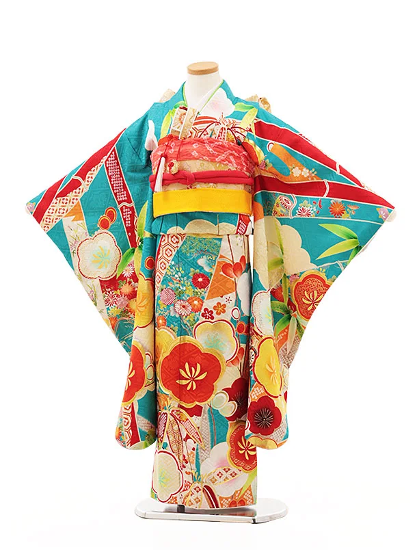 七五三(7歳結び帯)Y357【正絹】ターコイズ地 熨斗に梅