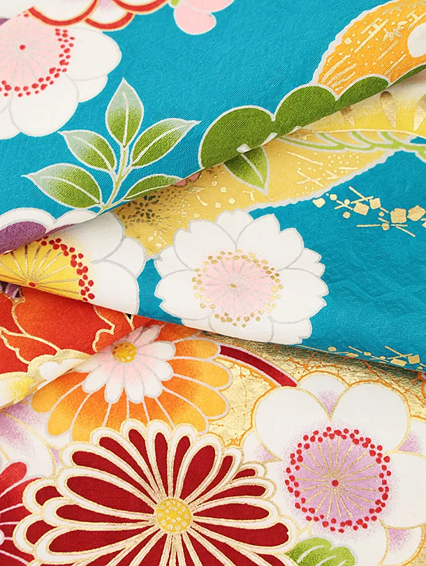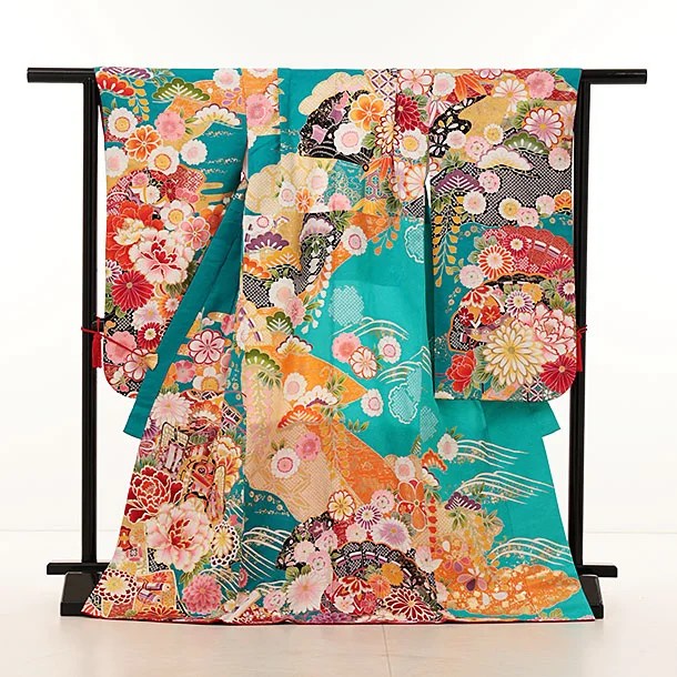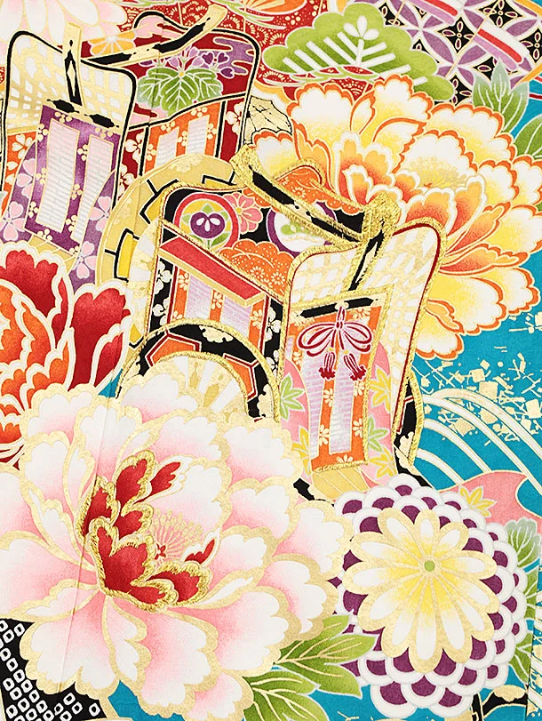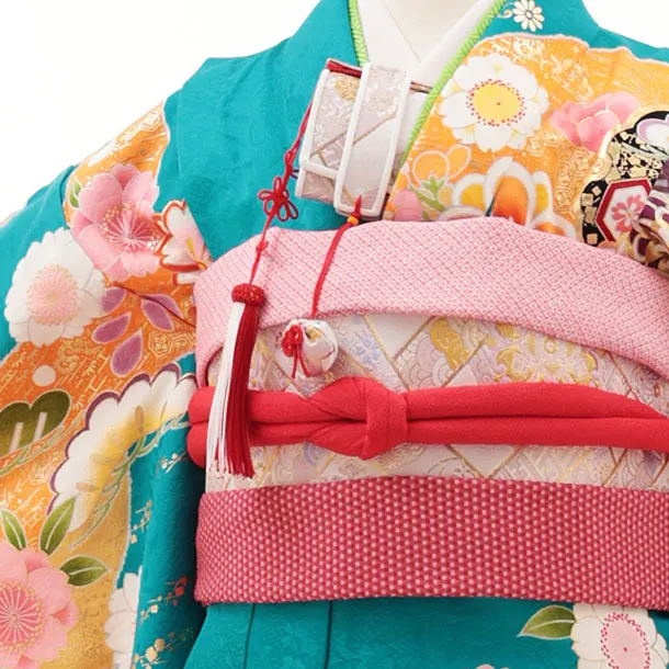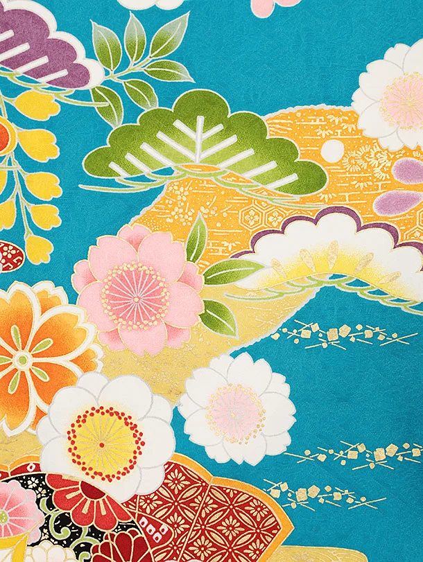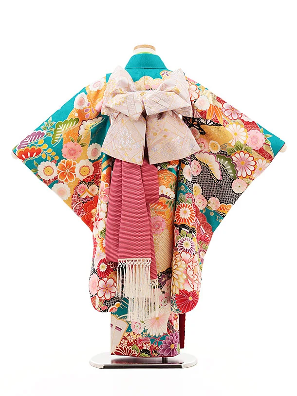 七五三(7歳結び帯)Y358【正絹】ターコイズ地 御所車 花づくし