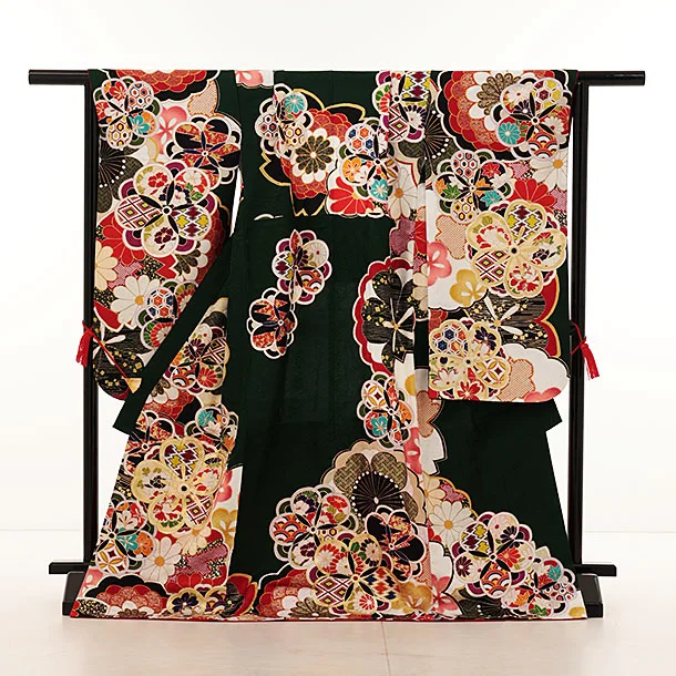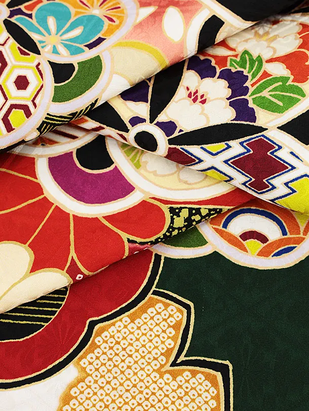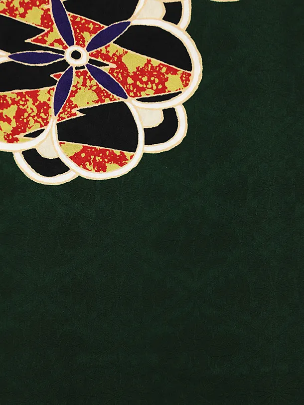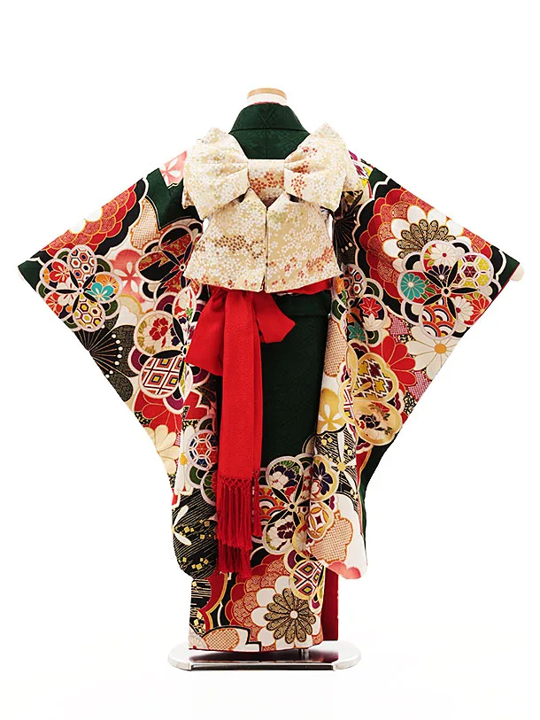 七五三(7歳結び帯)Y360【正絹】深緑地 古典花