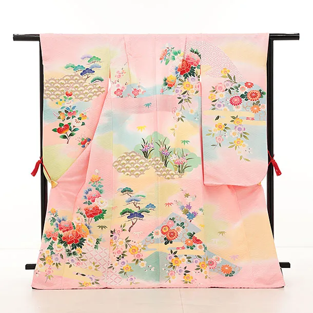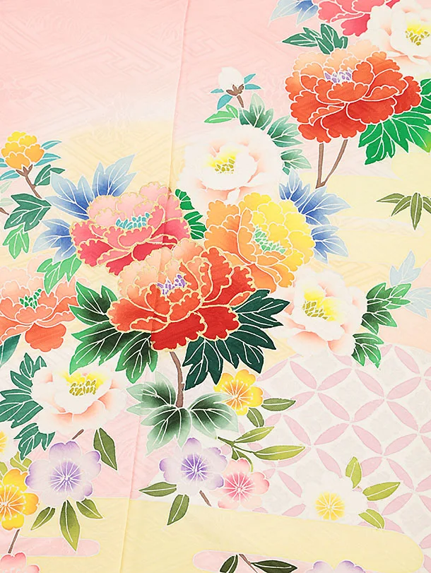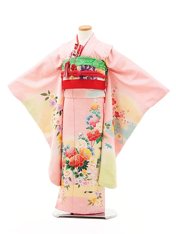 七五三(7歳袋帯)Y369【高級正絹】ピンク地 牡丹 花づくし