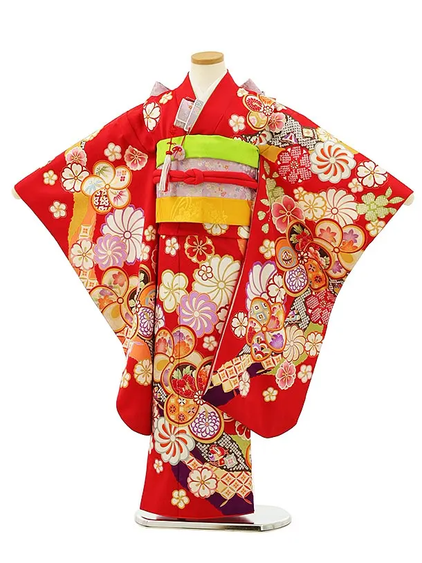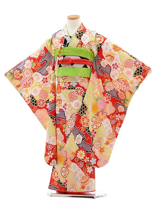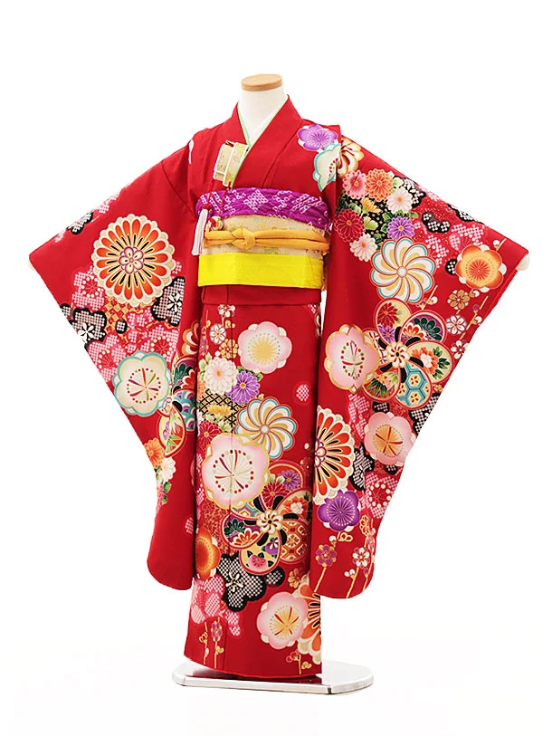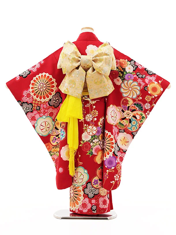七五三(7歳結び帯)Y389 赤地 ねじり梅菊