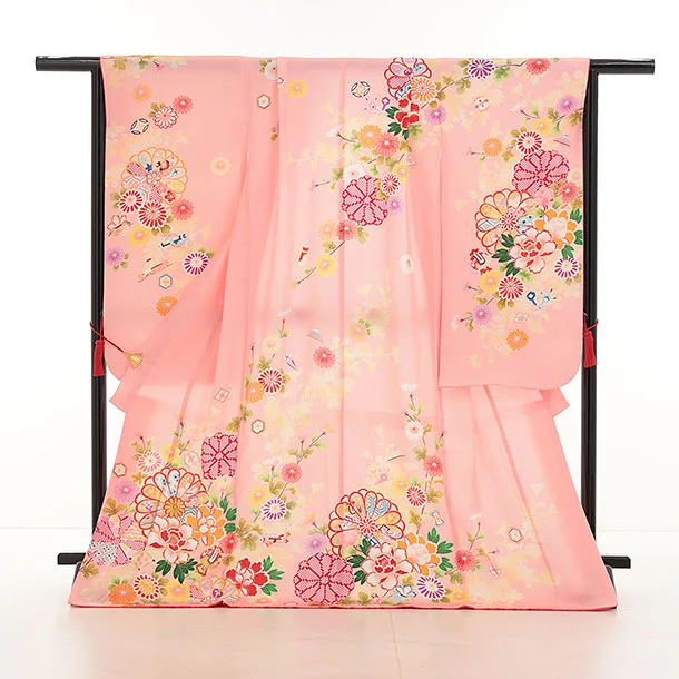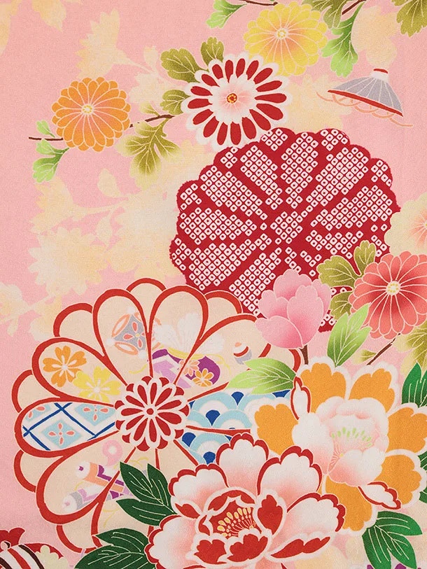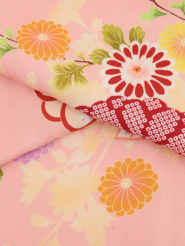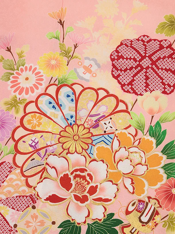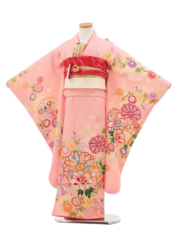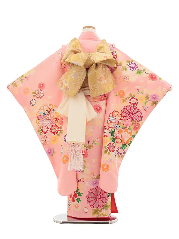 七五三(7歳結び帯)Y422【正絹】ピンク 四季花に宝尽し