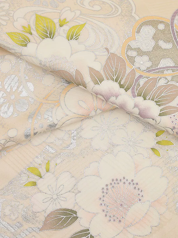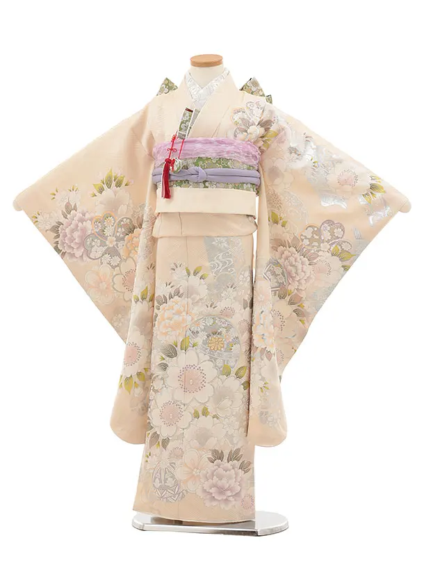 七五三(7歳結び帯)Y426【正絹】クリームベージュ 銀彩 鞠桜牡丹