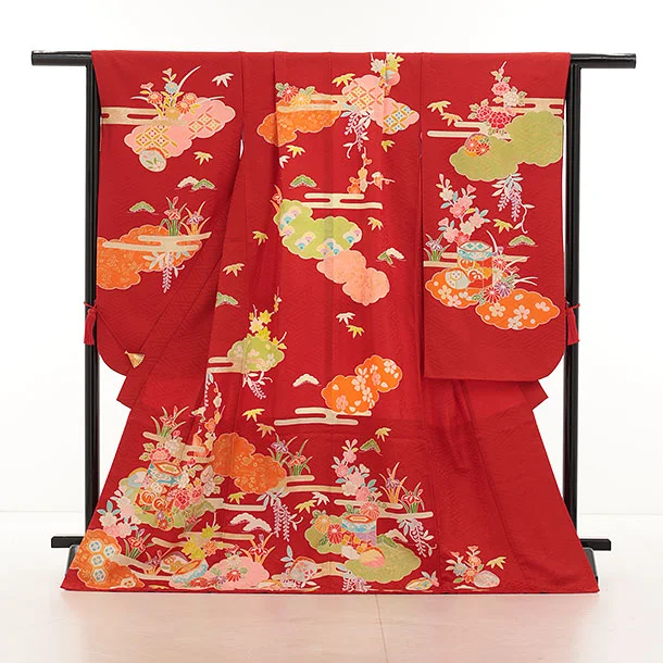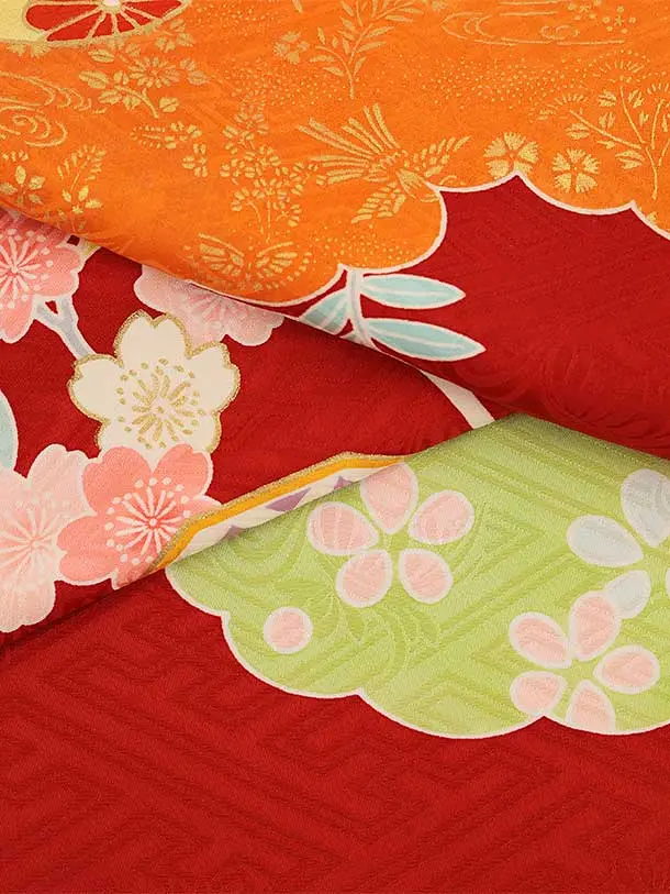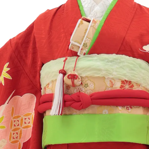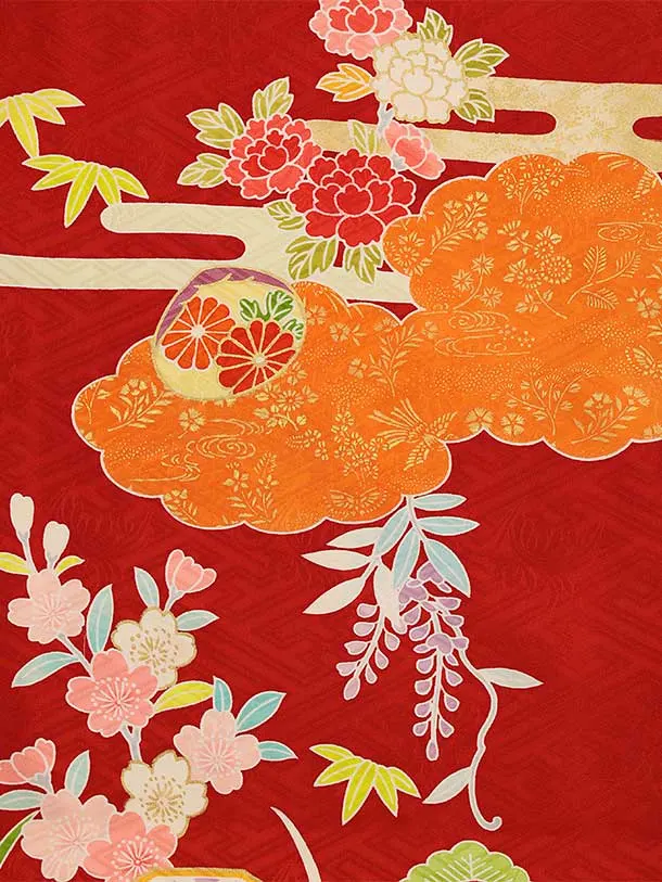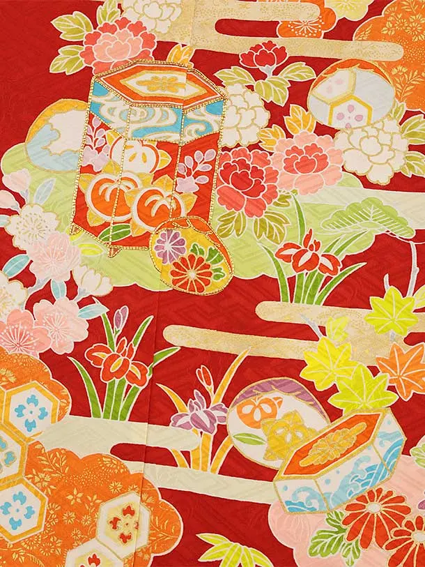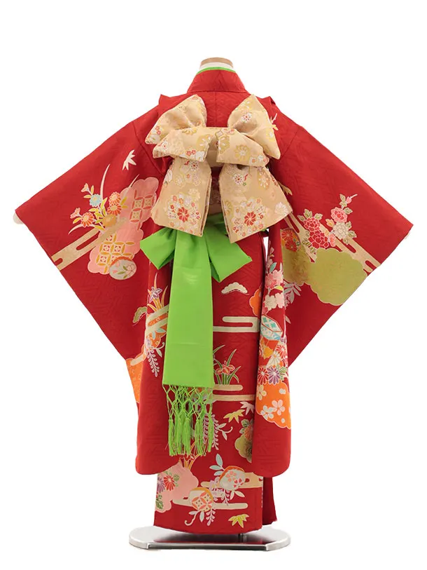 七五三(7歳結び帯)Y431【正絹】赤地 貝桶に四季花