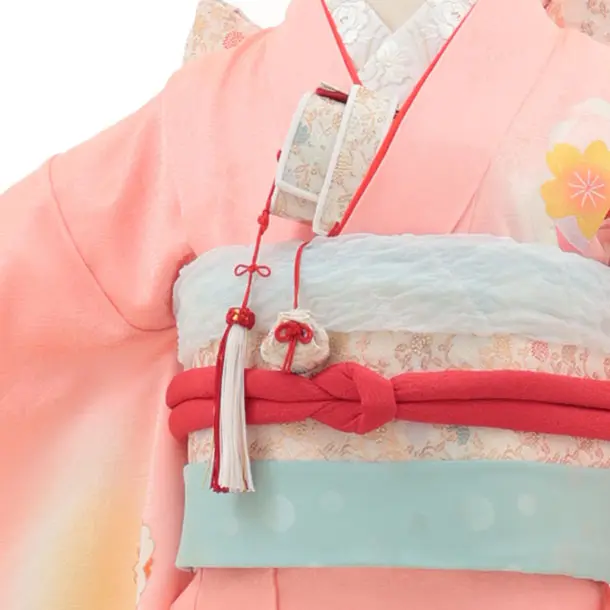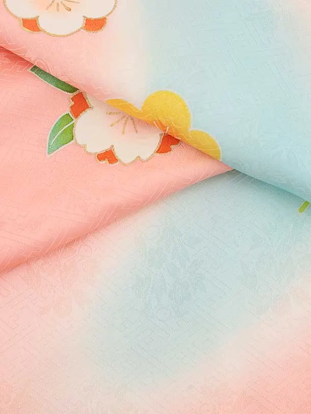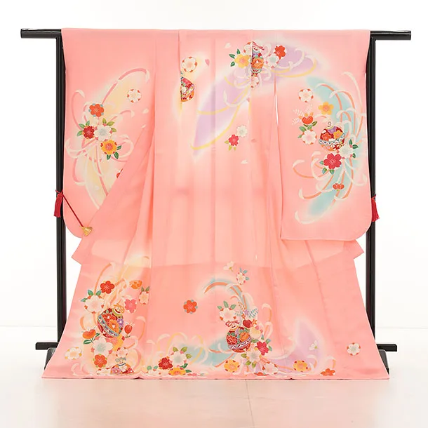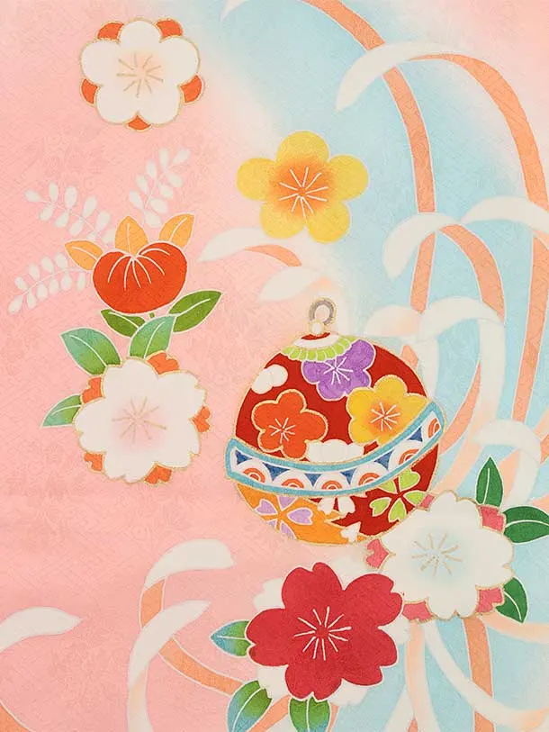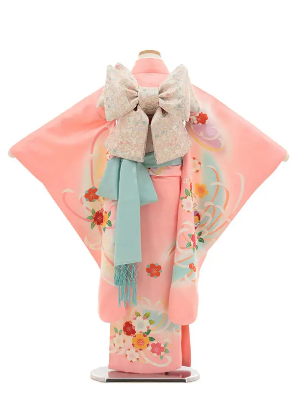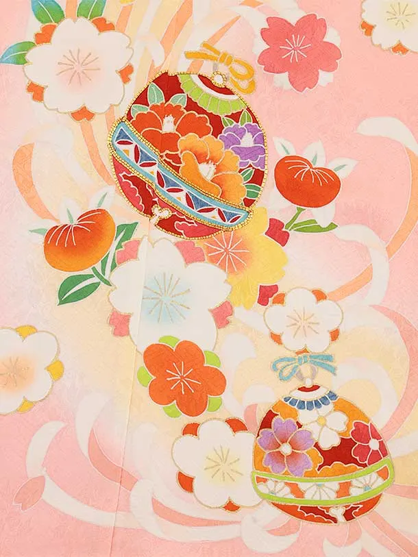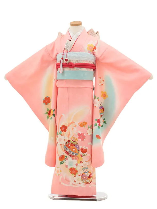 七五三(7歳結び帯)Y437【正絹】サーモンピンク 鈴に桜梅橘