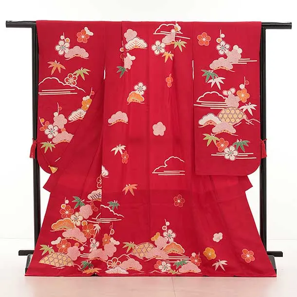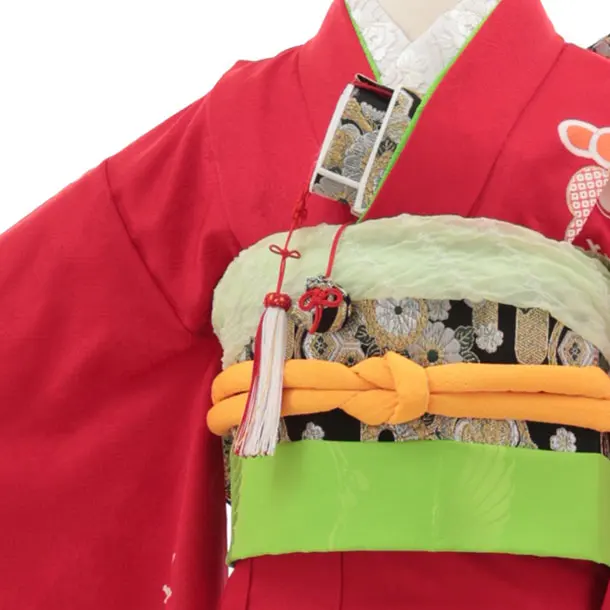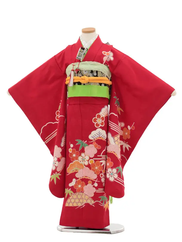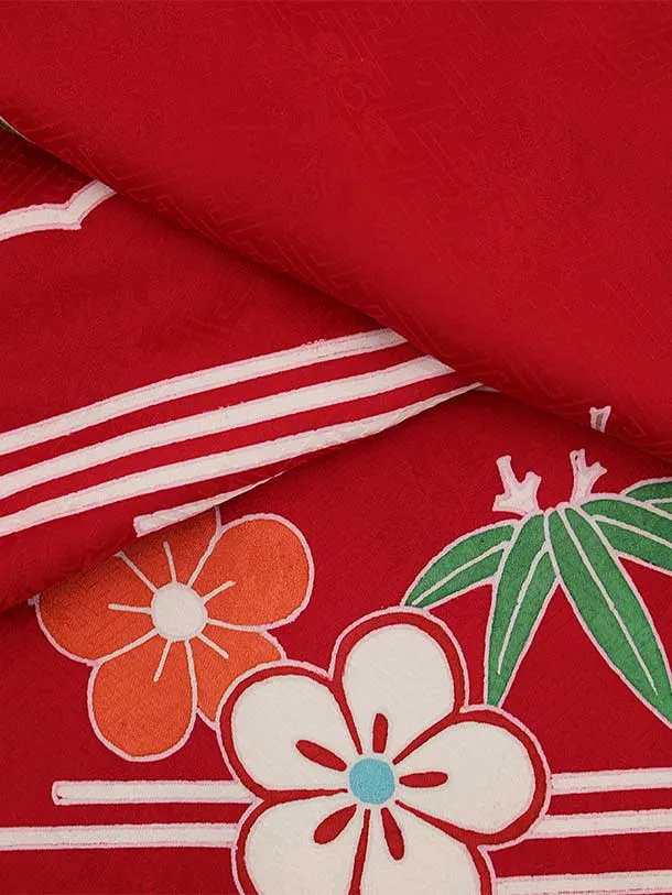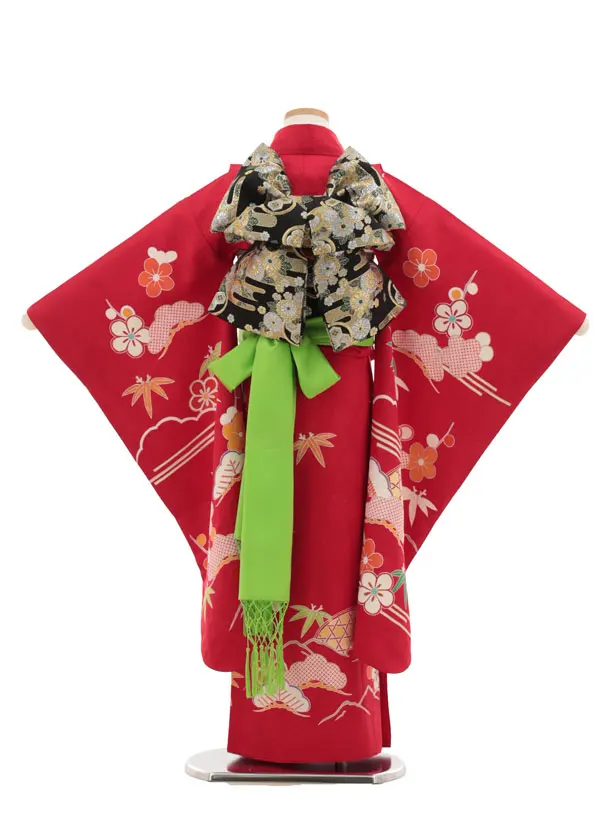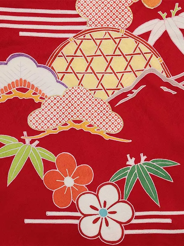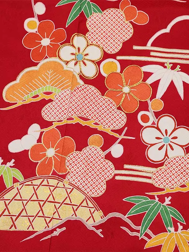 七五三(7歳結び帯)Y443【正絹】赤地 かごめに松竹梅