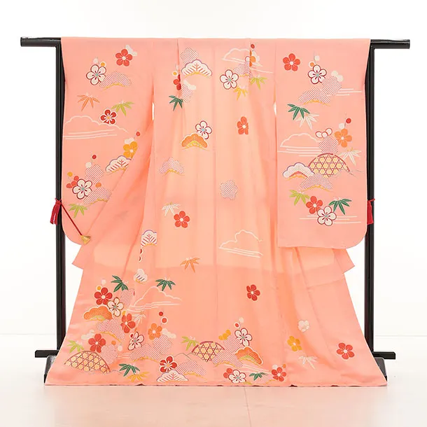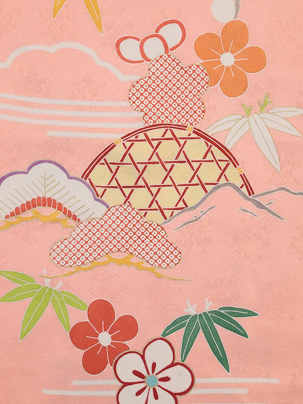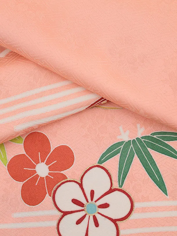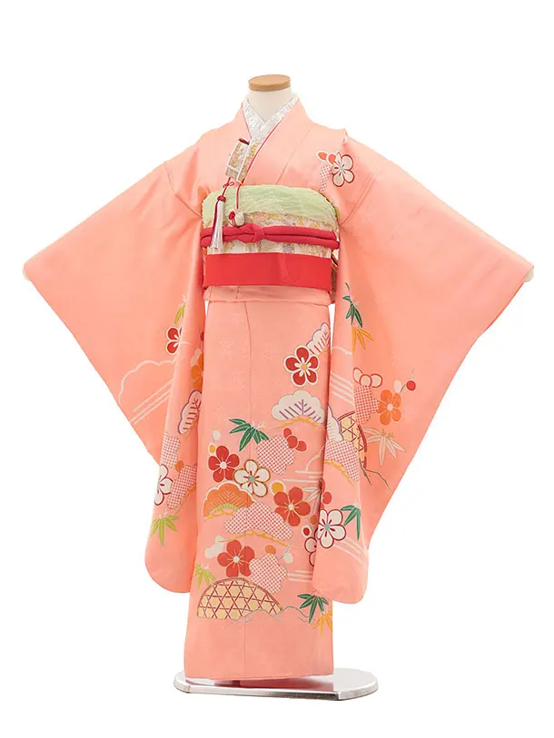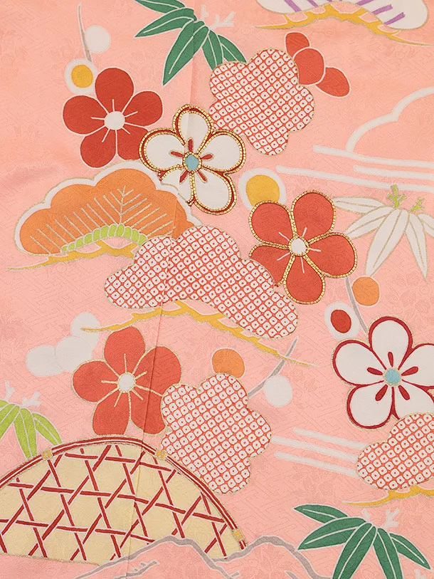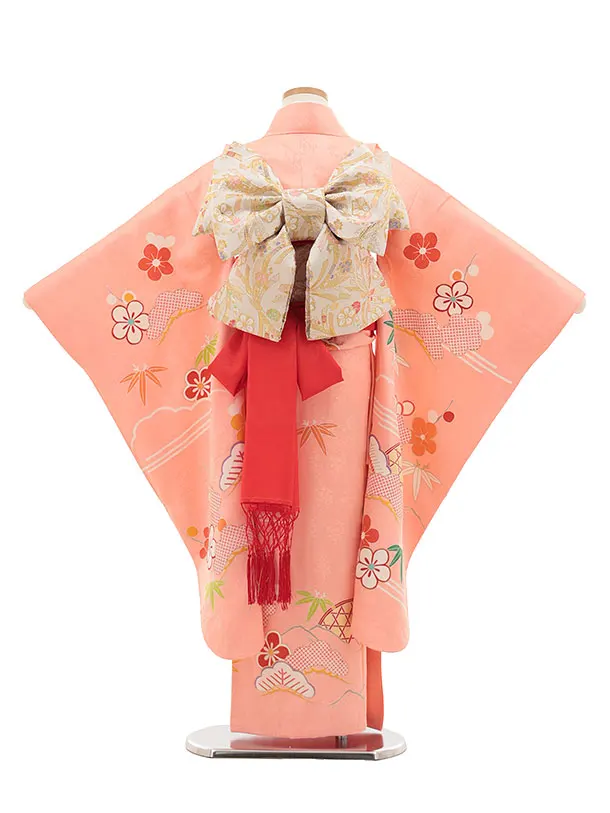 七五三(7歳結び帯)Y445【正絹】サーモンピンク かごめに松竹梅
