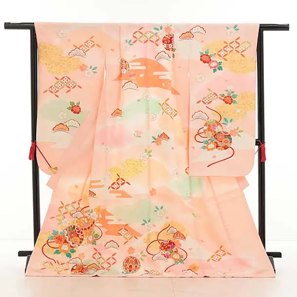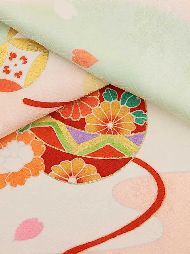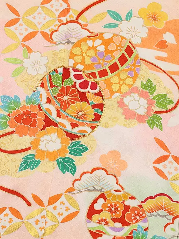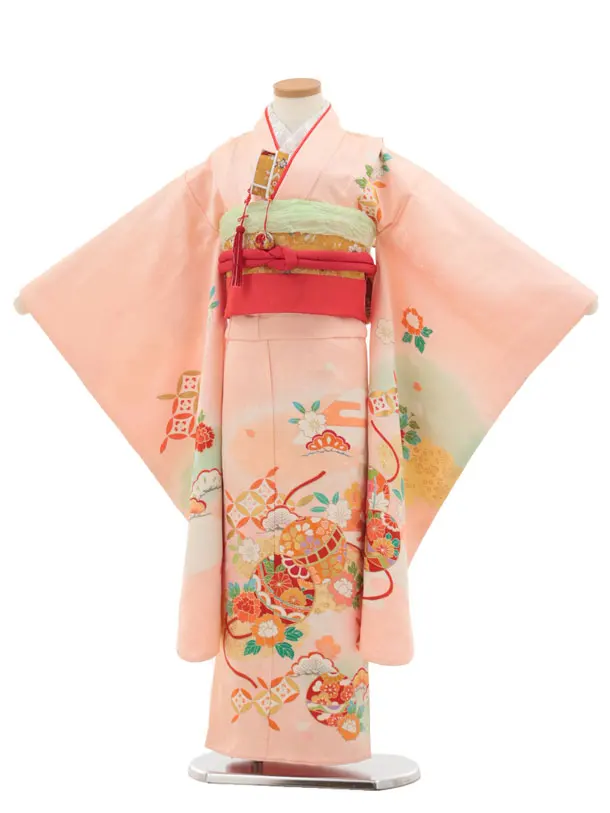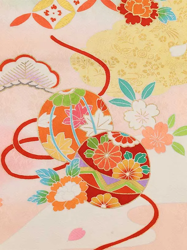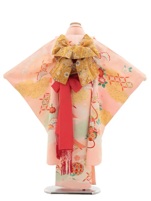 七五三(7歳結び帯)Y459【正絹】ピンク 鞠 七宝 四季花