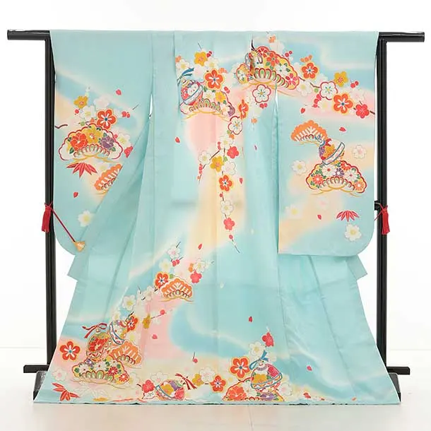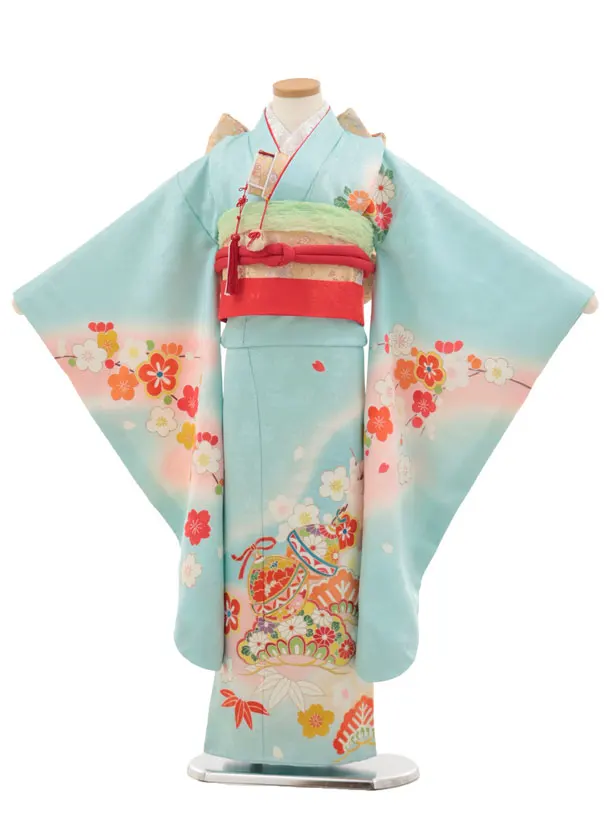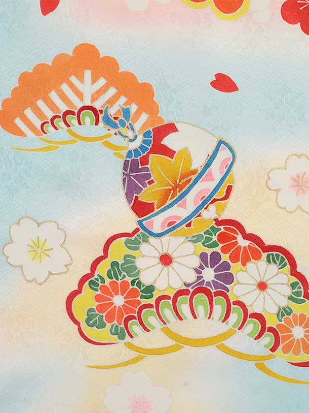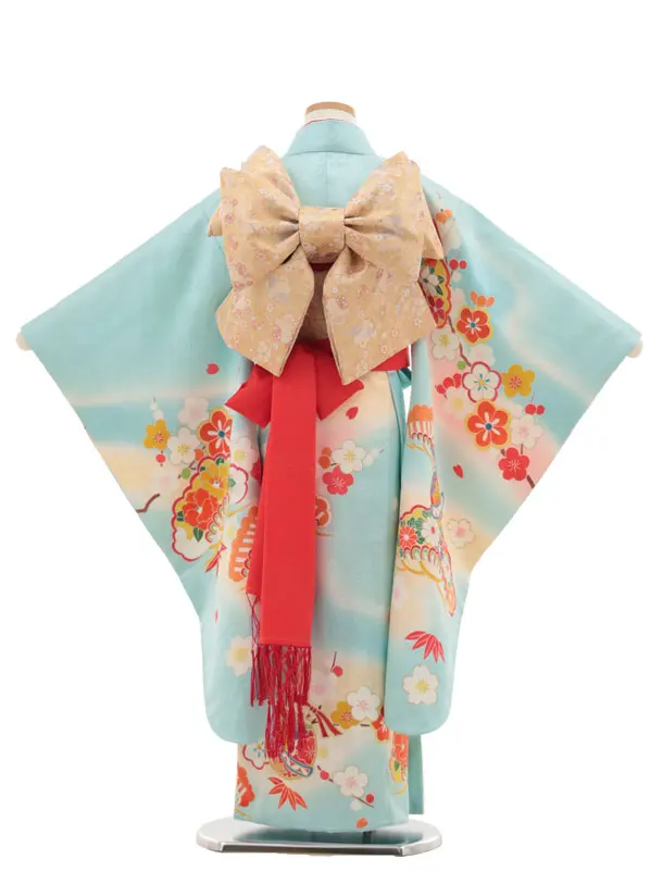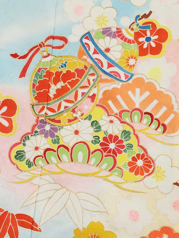 七五三(7歳結び帯)Y460【正絹】水色 鈴に松竹梅
