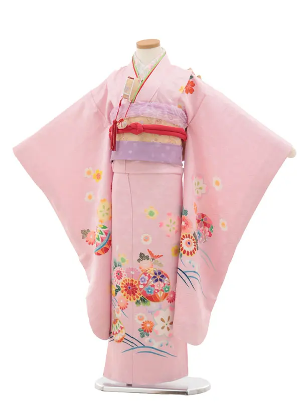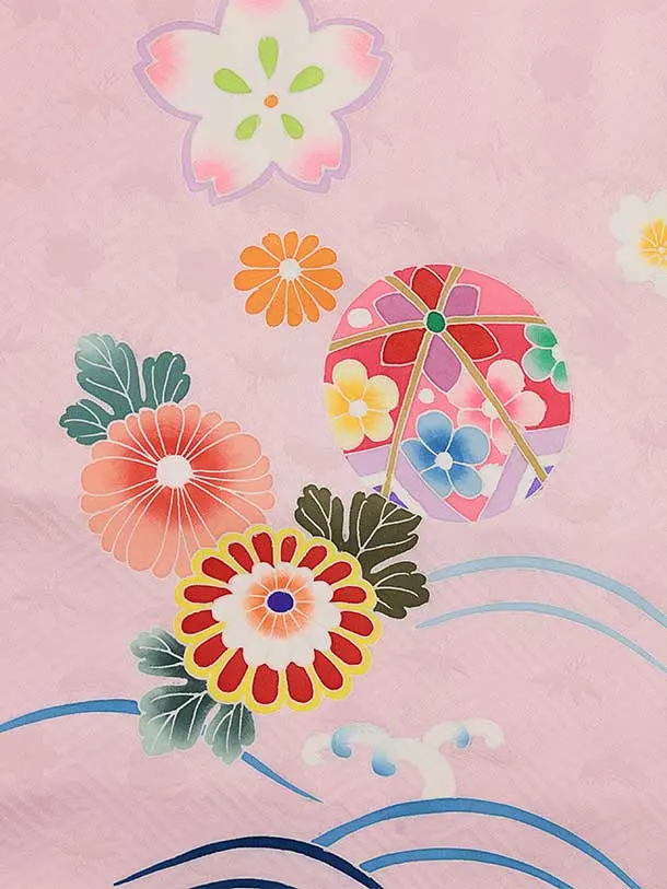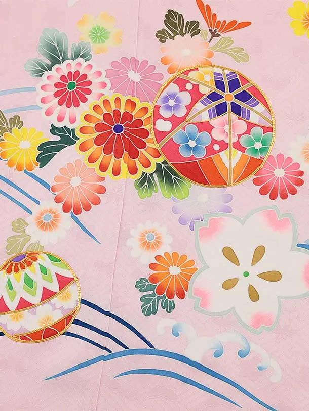 七五三(7歳結び帯)Y468【正絹】ピンク 波に鞠 菊桜