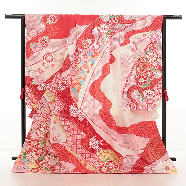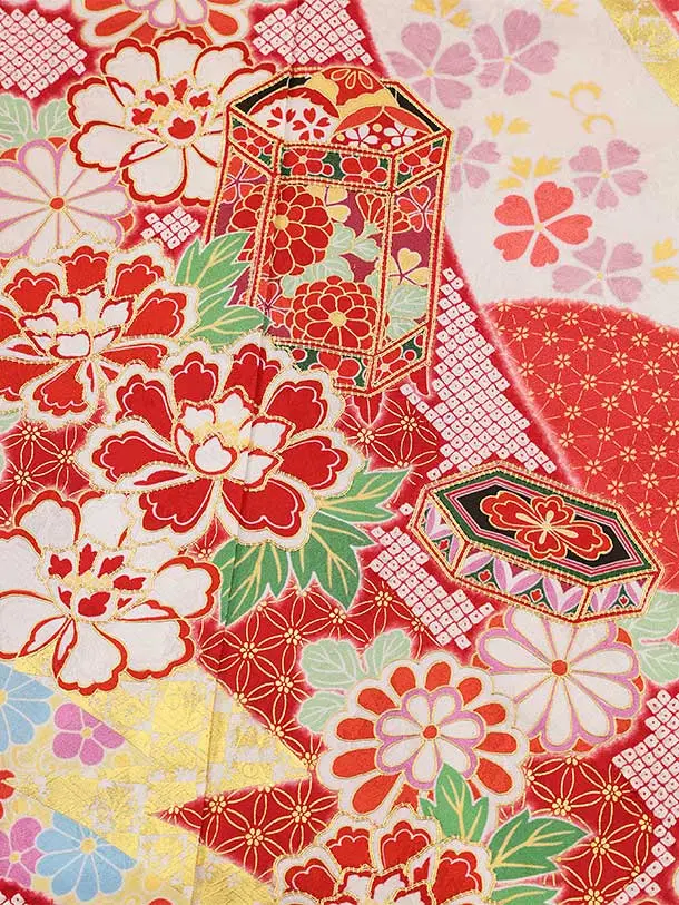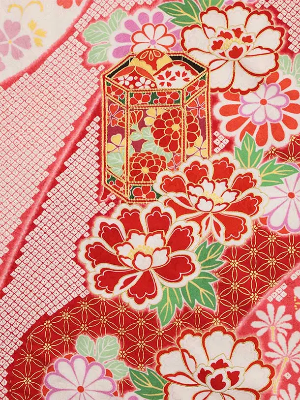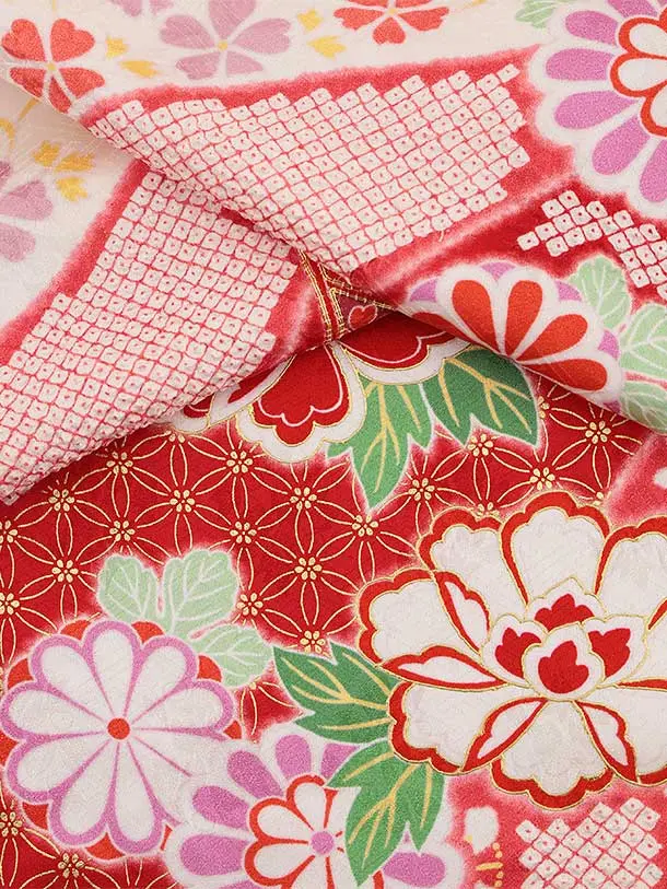 七五三(7歳袋帯)Y476【高級正絹】赤地 貝桶 花づくし