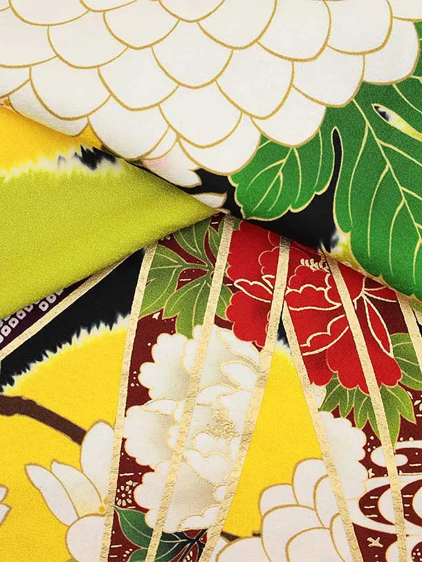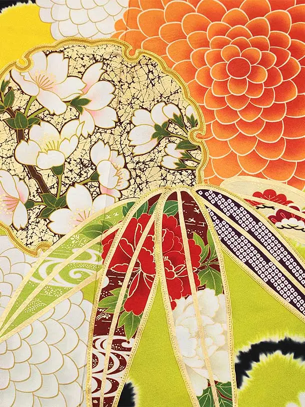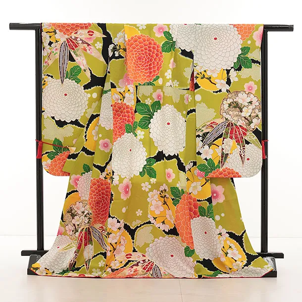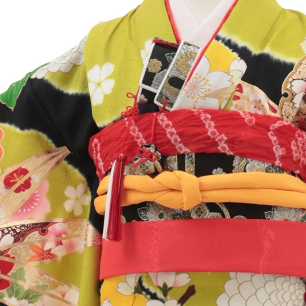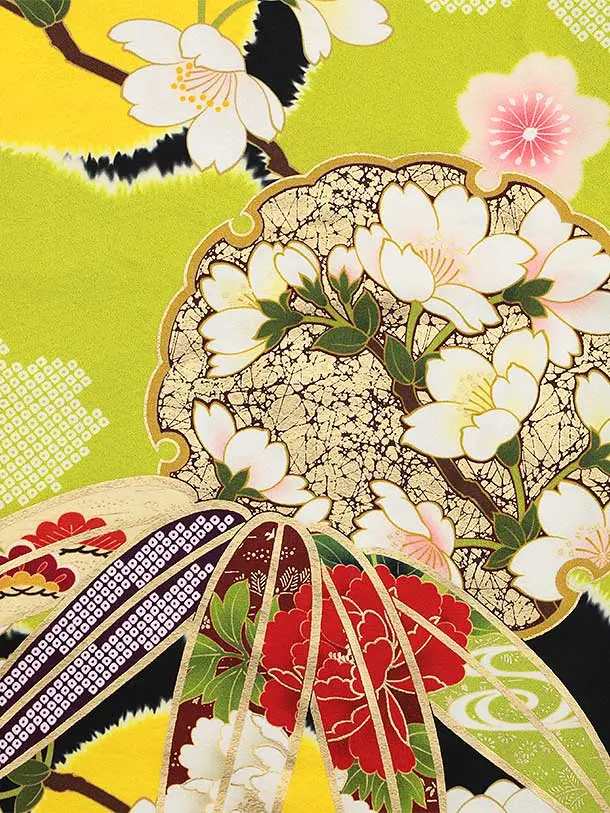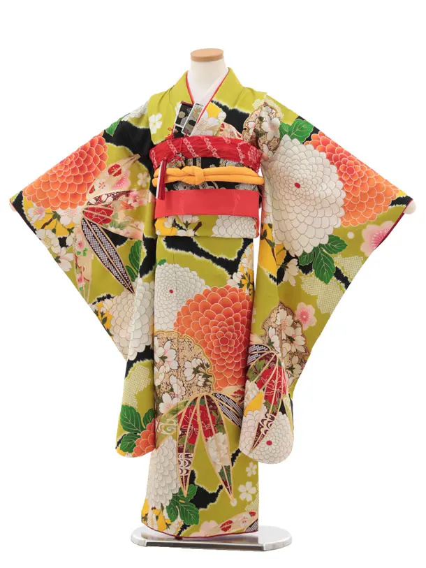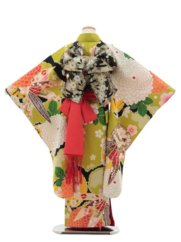 七五三(7歳結び帯)Y482【正絹】萌黄色 雪輪竹菊